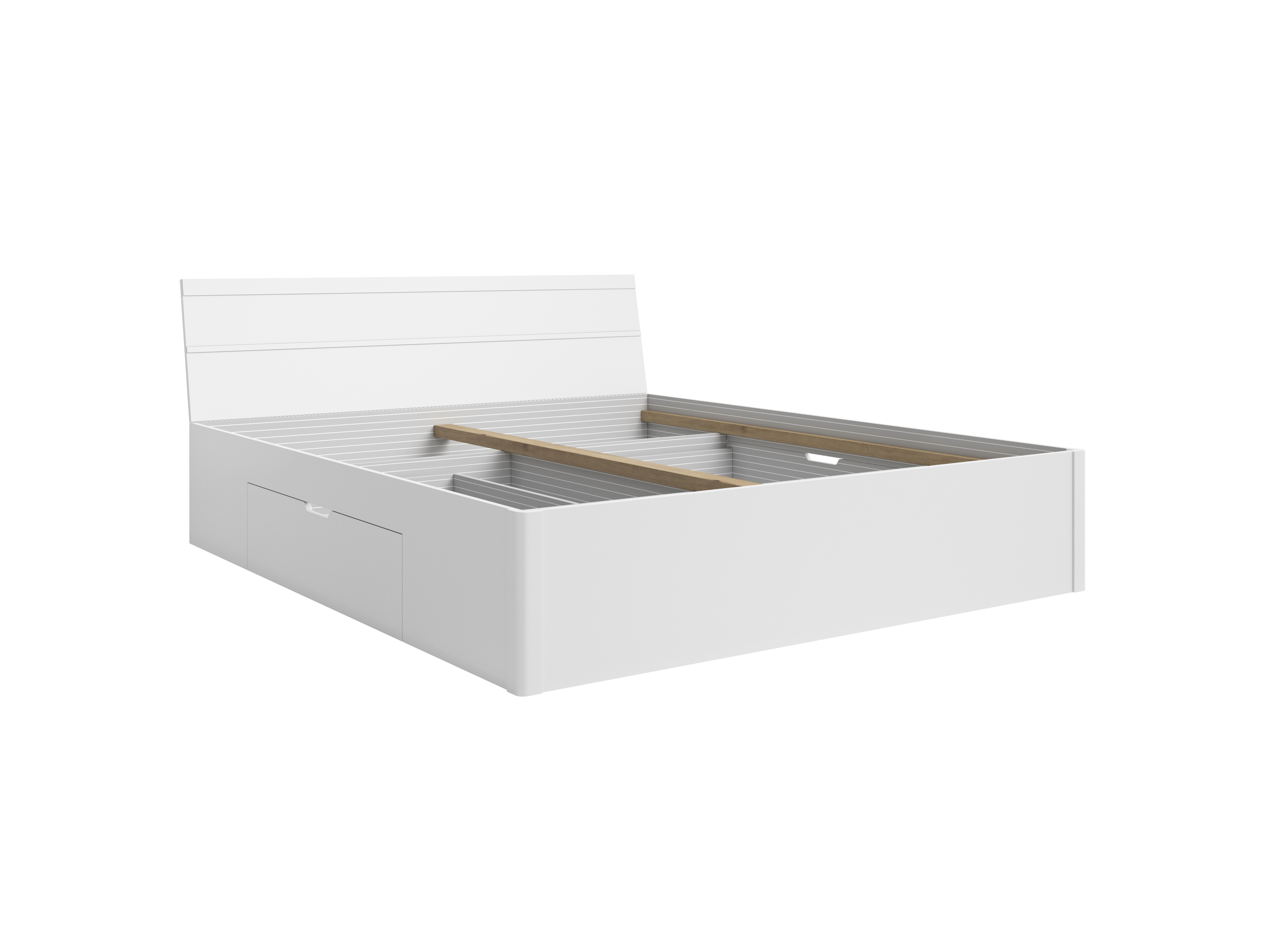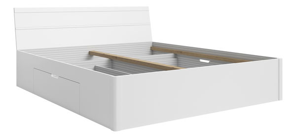 Manželská posteľ 160 cm Benson Typ 51 (biela) je moderná posteľ s dizajnovým čelom a praktickými zásuvkami na uloženie posteľného prádla, vankúšov a perín. Výsuvný priestor na kolieskach má maximálne zaťaženie 10 kg. Posteľ je vyrobená z laminovanej drevotriesky s impregnovaným dekoratívnym papierom alebo fóliou odolnou voči vode, teplote a chemikáliám. Zadná doska je z sololitu a hrany sú z ABS materiálu. Posteľ je dodávaná v 3 balíkoch a odporúča sa k nej matrac so zabudovaným roštom.