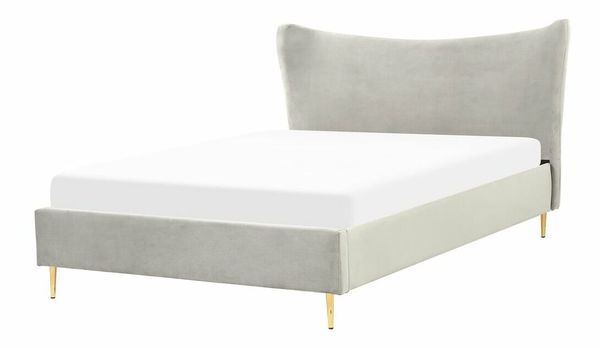 Táto štýlová moderná posteľ dodá vašej spálni trendový a elegantný vzhľad. Rám a vysoké čelo sú čalúnené na dotyk príjemnou zamatovou látkou v nádhernom svetlosivom odtieni. Tenké zlaté nohy podčiarkujú celkový dizajn a čalúnenie postele, zatiaľ čo drevený lamelový rošt zlepšuje pohodlie počas spánku.