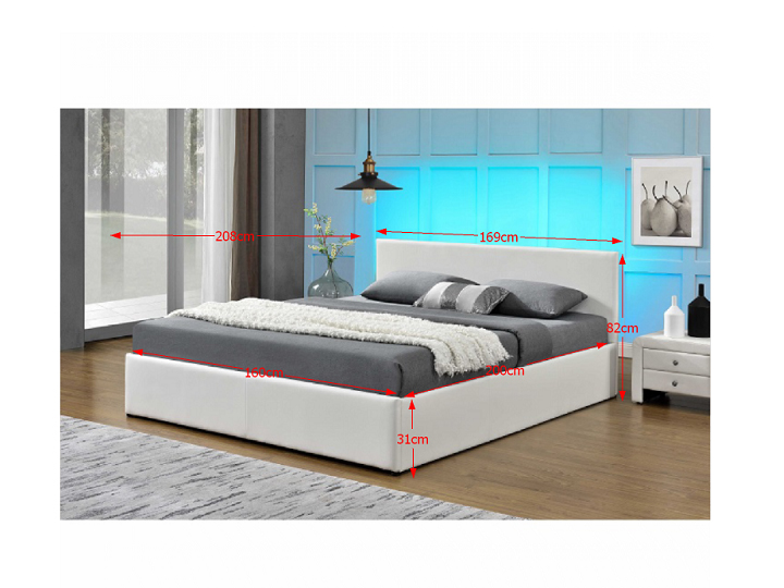 Moderná manželská posteľ s podmanivou eleganciou. Pôvabnosť jej dodáva zabudované RGB LED osvetlenie, ktoré vyčarí príjemnú atmosféru. Posteľ je čalúnená ekokožou a dodávana s výklopným lamelovým roštom. Úložný priestor postele je tvorený látkou, ktorá je upevnená na rám postele suchým zipsom.