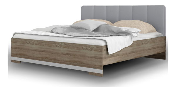 Manželská posteľ s vysokým čelom pri hlave v odtieni šedej farby z materiálu Ekokoža. Prevedenie postele je dub sonoma trufel so sivými prvkami ekokože.