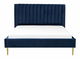 Elegantná posteľ v modernom štýle s vysokým a hrubo vystužený operadlom. Klasický obdĺžnikový tvar postele dopĺňa prešívané čelo, ktoré posteli dodáva moderný vzhľad. Nohy sú perfektne vyvážené a neodvádzajú pozornosť od elegantného dizajnu, ale zaisťujú silnú, pevnú a odolnú konštrukciu. Celá posteľ je čalúnená tmavomodrým zamatom, ktorý jej dodáva sofistikovaný vzhľad.