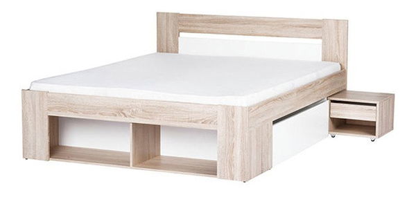 Posteľ z modelovej rady Milo moderného prevedenia je vyrobená z kvalitnej LTD vo farebnej kombinácii dub sonoma a biela. Posteľ obsahuje na každej strane zásuvku pod posteľ a nočný stolík so zásuvkou, ktorý je možno zasunúť pod posteľ. V nohách postele je regál.