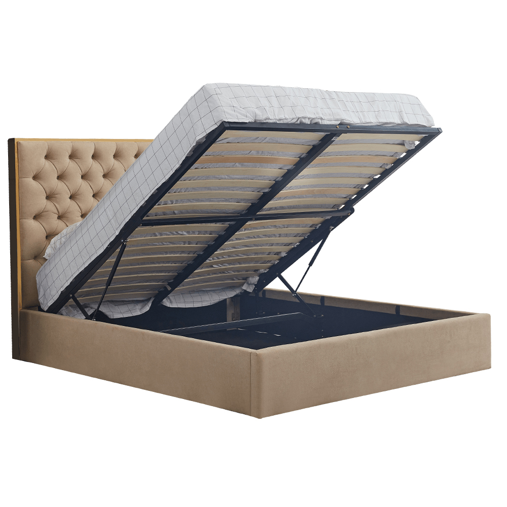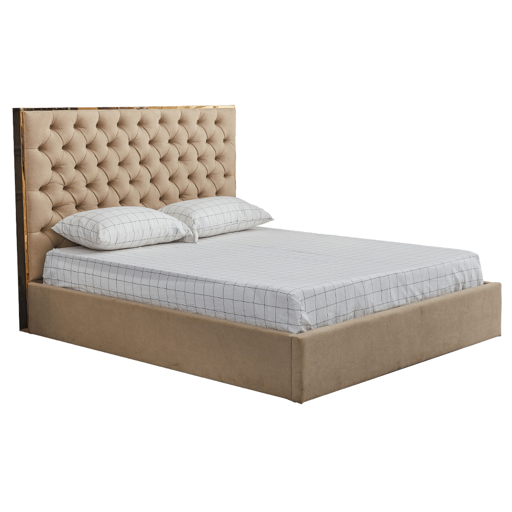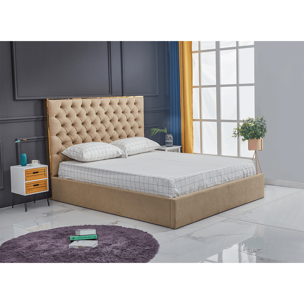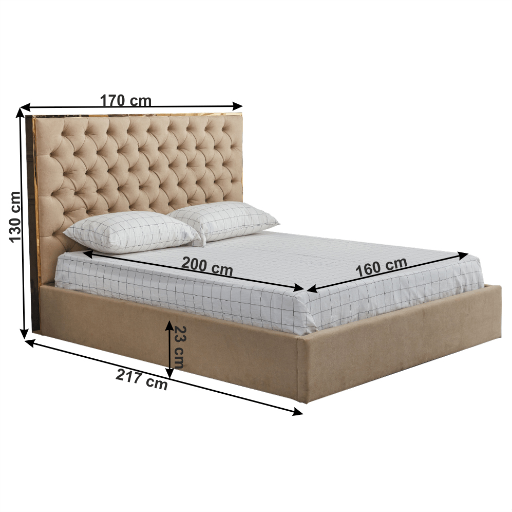 Posteľ Nadina sa stane vaším najobľúbenejším spoločníkom každý večer pri zaspávaní a každé ráno pri vstavaní a vítaní nového dňa. Komfort postele vám vyčarí úsmev na perách. Dekoratívne prešívané vysoké čelo postele ochráni pred prievanom, ale poskytne aj oporu pre chrbát pri sledovani TV alebo čítaní obľúbenej knihy. Elegantnou ju robí aj dekoratívny rám po obvode čela z nehrdzavejúcej ocele v zlatej farbe. Vďaka béžovému prevedeniu ju jednoducho zakomponujete aj do už zariadenej spálne. Nadina ponúka dostatočne veľký úložný priestor. Posteľ je dodávaná s lamelovým roštom bez matraca.