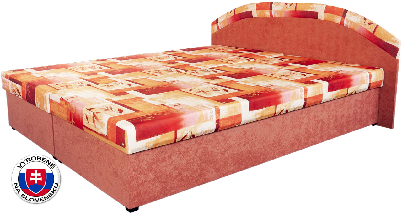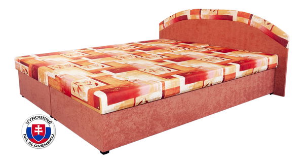 Manželská posteľ oranžovej farby s poloblúkovým čelom a strakatým vzorom spacej časti je vhodná do každej spálne. Čalúnenie je vyrobené z kvalitnej látky mikrofáza/polyester, matrac je z PUR peny. Do priestorného úložného priestoru sa dostanete po odklopení spacej časti z boku. Plocha lôžka je 160x195 cm a výška spania 42 cm.
