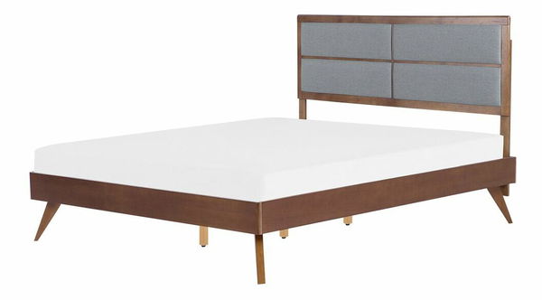 Tento výnimočný rám postele dokonale kombinuje moderné a rustikálne prvky. Čelo postele vyrobené z odolného materiálu MDF v tmavom prevedení je čiastočne čalúnené sivým polyesterom. Štyri čalúnené obdĺžniky kontrastujú s odhaleným drevom a vytvárajú pohodlný povrch, o ktorý sa môžete pohodlne oprieť. Posteľ sa dodáva s lamelovým roštom vyrobeným z prírodného kaučukového dreva, ktorý podopiera matrac a zaručuje rovnomerné rozloženie telesnej hmotnosti, čo zaručuje zdravý a nerušený spánok.