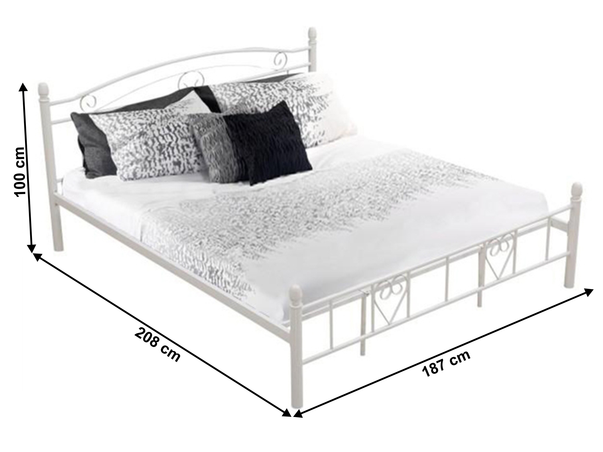Manželská posteľ 180 cm Birdie (biela) s výškou 100 cm, šírkou 187 cm a hĺbkou 208 cm je kovová posteľ s lamelovým roštom, ktorá vám poskytne stabilné a pohodlné dvojlôžko. Posteľ je zdobená očarujúcimi ornamentmi, ktoré dodávajú romantický nádych a vy sa budete cítiť ako princezná alebo princ. Jej veľkosť vás poteší, pretože má dostatočnú plochu na spanie až 180x200 cm. V bielom prevedení je táto posteľ vhodná pre mladých tínedžrov a zaľúbené páry.