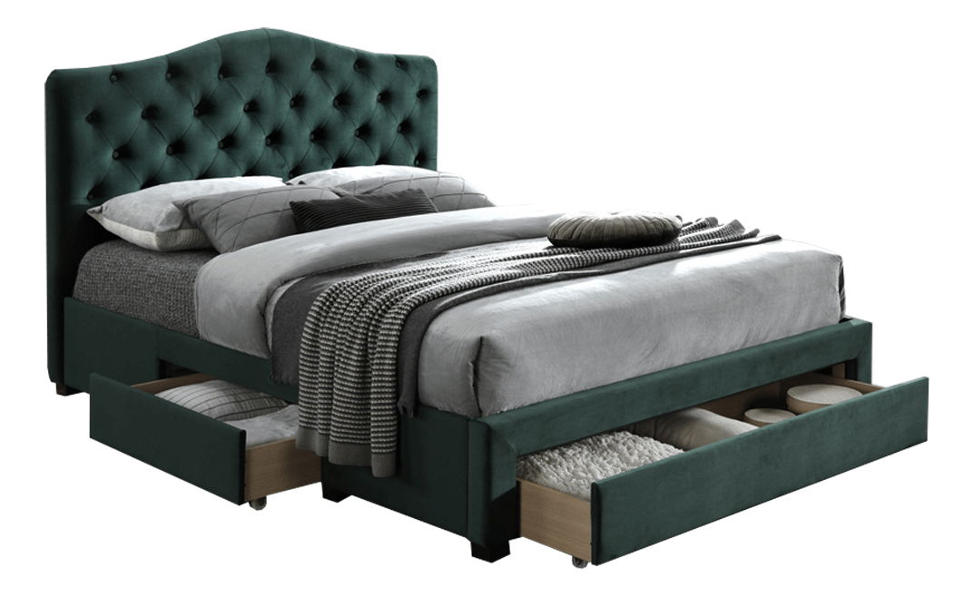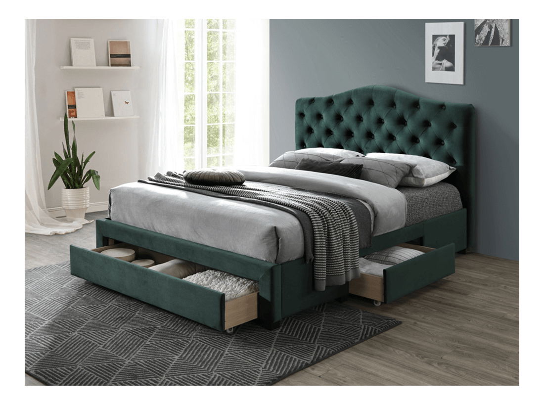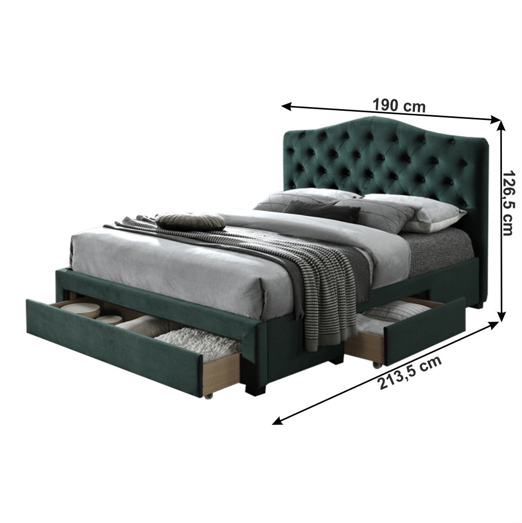 Manželská posteľ Kelpea s rozmerom 180x200 cm je dokonalým doplnkom vášho spálne. Táto posteľ je zahalená v krásnej smaragdovej Velvet látke, ktorá dodáva miestnosti exkluzívny vzhľad. Posteľ je dodávaná s lamelovým roštom a disponuje úložným priestorom v podobe troch zásuviek, ktoré sú dostupné z oboch strán postele. Vysoké prešívané čelo dokonale podoprie váš chrbát pri čítaní a oddychu. Posteľ je vyrobená z kvalitného materiálu, má nosnosť na jedno lôžko až 110 kg a je dodávaná bez matraca. Táto luxusná posteľ Kelpea je tým, čo potrebujete pre dokonalý spánok a relax. Odporúčame ju umiestniť do dostatočne veľkého priestoru.