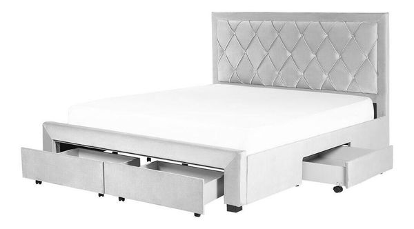 Vytvorte si elegantnú spálňu pomocou tejto čalúnenej postele. Je čalúnená kvalitnou zamatovou látkou, takže má nielen zaujímavý dizajn, ale je aj odolná a príjemná na dotyk. Vysoké prešívané čelo zaisťuje výnimočné pohodlie. Súčasťou postele sú zásuvky, do ktorých môžete uložiť pyžamo, posteľnú bielizeň alebo menšie prikrývky. Zásuvky sú navyše vybavené kolieskami, vďaka ktorým sa dajú ľahko otvoriť. Rošty z masívneho dreva, ktoré sú súčasťou postele, zaručujú pohodlný a ničím nerušený spánok.