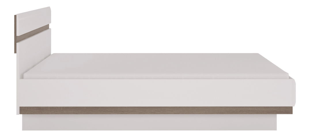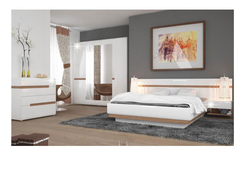 Manželská posteľ 180 cm Lysander Typ 93, s výškou 86 cm a hĺbkou 206 cm, ponúka dizajnové riešenie pre eleganciu v spálni. Biela farba s dubovým sonoma truflovým pásom na čele postele a po obvode na jej spodnej časti dodáva interiéru moderný vzhľad. Posteľ je dodávaná bez roštu a matraca, ktoré si môžete vybrať v našom internetovom obchode. Sektorová zostava Lynatet je skvelou voľbou pre zariadenie obývacej izby. Vyrobená z laminovanej DTD je odolná voči poškriabaniu, vode a vysokej teplote. Farebné prevedenie je biela v kombinácii s farbou dreva dub sonoma truflový. Predné časti sú vyrobené z MDF bielej farby s extra vysokým leskom HG. Dvierka jednotlivých skriniek majú moderné zaoblené hrany. Odporúčame zakúpiť matrac s rolovaným roštom s minimálnou výškou 20 cm.
