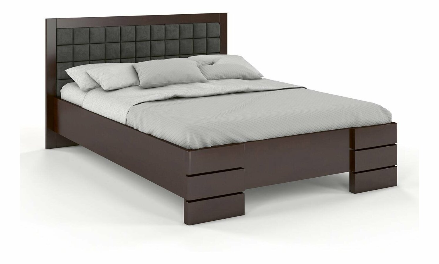 Manželská posteľ Storhamar High s rozmermi 180 x 210 cm je skvelou voľbou pre tých, ktorí preferujú moderný a minimalistický dizajn. Vynikajúci dizajn s vysokým čelom, ktoré je čalúnené a prešívané, je jednou z hlavných výhod tohto produktu. Konštrukcia postele je pevná a stabilná, so strednou časťou podopretou tzv. "piatou nohou" pre zvýšenie stability. Posteľ bola vyrobená z bukového dreva s minimálnym počtom uzlov a s dvojitým tvrdým lakom pre väčšiu odolnosť. Produkt je k dispozícii s predĺženou dĺžkou a v rôznych farbách morenia. Záruka na posteľ je až 8 rokov. Poznámka: Posteľ sa dodáva bez matraca a roštu.