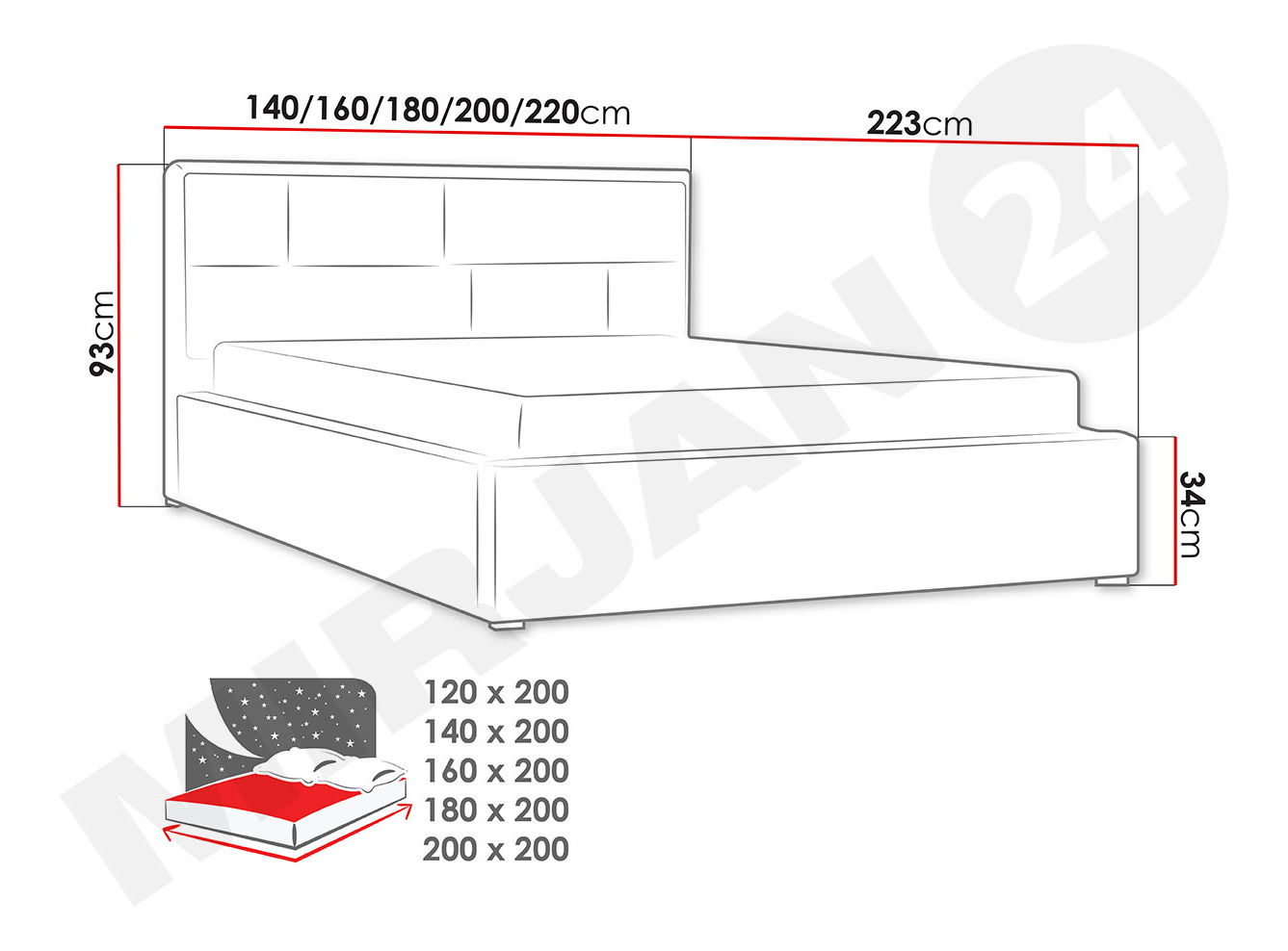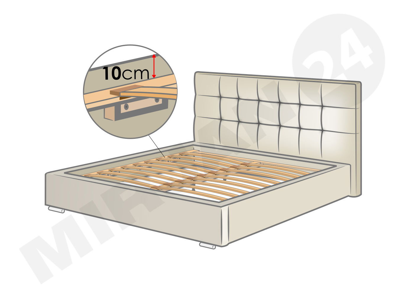 ZobraziťČalúnenná posteľ s roštom je ideálnou voľbou pre tých, ktorí hľadajú pohodlie a štýl. Čalúnená posteľ s úložným priestorom a roštom Nido. Čalúnené čelo postele je zdobené prešívaním, ktoré vytvára väčšie a menšie obdĺžniky. Tento zaujímavý vzor dodáva posteli moderný vzhľad. Okrem toho bol model vyrobený z vysoko kvalitných komponentov. Rám a čelo postele boli zosilnené, rám je založený na pevnej kovovej konštrukcii a posteľ obsahuje úložný priestor. Dostupné rozmery: 140 - šírka: 160 cm, výška: 93 cm, dĺžka: 223 cm, plocha na spanie: 140 x 200 cm, 160 - šírka: 180 cm, výška: 93 cm, dĺžka: 223 cm, plocha na spanie: 160 x 200 cm, 180 - šírka: 200 cm, výška: 93 cm, dĺžka: 223 cm, plocha na spanie: 180 x 200 cm prevedenie : hrúbka materiálu - 18 mm (zosilnený rám a čelo postele) rošt je umiestnený na kovovom ráme, vďaka dvom plynovým piestom sa ľahko dvíha rám vybavený obmedzovačom pohybu matracov, úložný priestor dno úložného priestoru je vyrobené z 6 mm HDF dosky v bielej farbe, boky zakončené 1 cm hrubou penou a vatou 100 opierka hlavy zakončená penou 2-3 cm a vatou 200 plastové nohy, posteľ neobsahuje matrac nosnosť 125 kg na stranu Rozmery úložného priestoru: 200 / 200: dĺžka: 200, šírka: 200, výška: 20 cm 180 / 200: dĺžka: 200, šírka: 180, výška: 20 cm 160 / 200: dĺžka: 200, šírka: 160, výška: 20 cm 140 / 200: dĺžka: 200, šírka: 140, výška: 20 cm 120 / 200: dĺžka: 200, šírka: 120, výška: 20 cm Záruka: 24 mesiacov