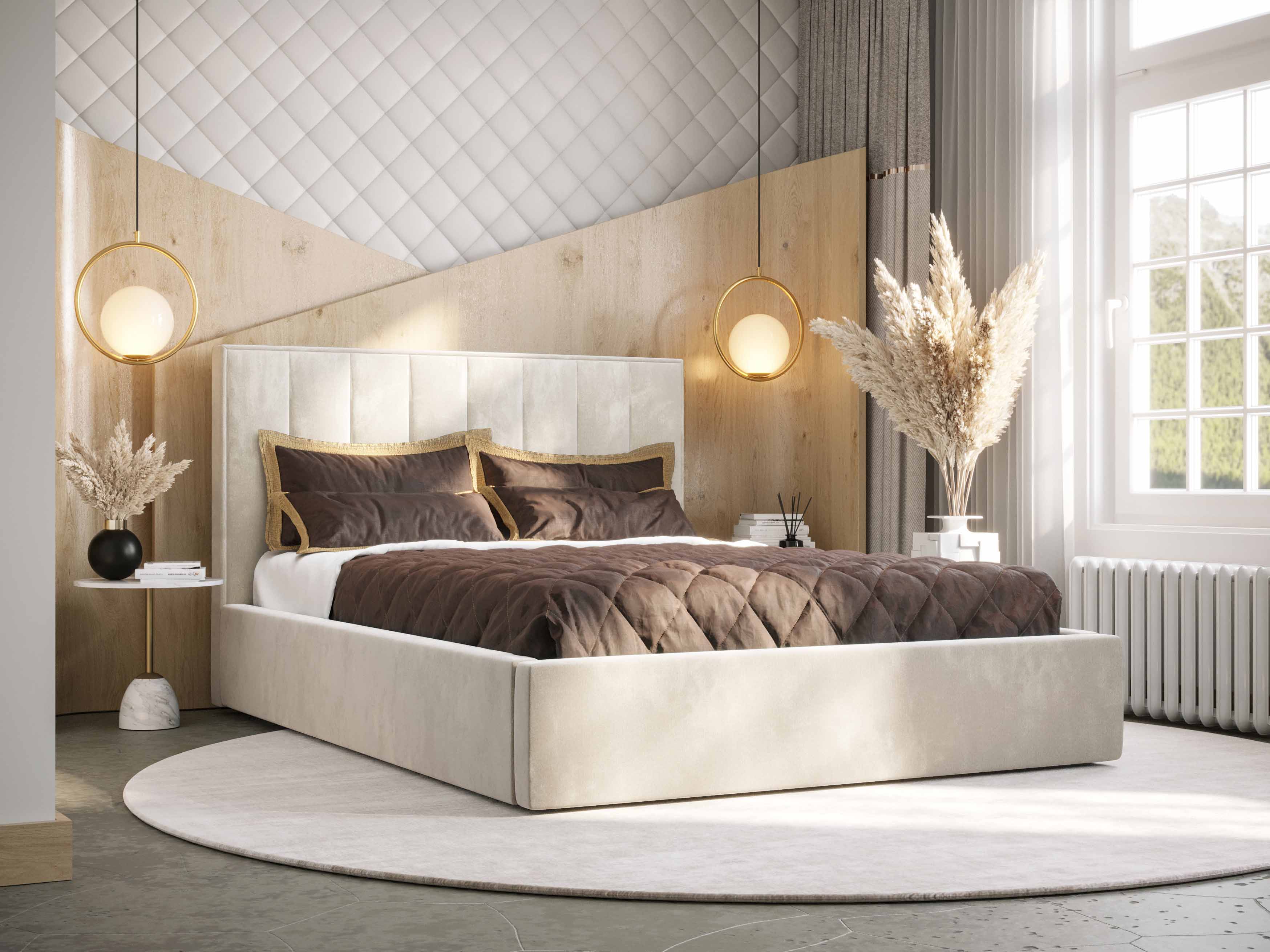 Manželská posteľ Ocie s rozmerom 180x200 cm a béžovým Monolith 02 čelom je ideálnym doplnkom vašej spálne. Posteľ disponuje úložným priestorom na posteľnú bielizeň a roštom. Pre maximálny komfort vám ponúkame možnosť priobjednať si matrac s výškou a pružinou bonell. Konštrukcia je vyrobená z kombinácie drevotriesky a dreva, zatiaľ čo čelo postele je plasticky riešené s vertikálnymi záševkami v tkanine. S výškou čela 115 cm a dĺžkou 210 cm poskytuje posteľ dostatok priestoru na príjemný spánok. Maximálne zaťaženie postele je 240 kg a je dodávaná v troch balíkoch s rôznymi rozmermi.