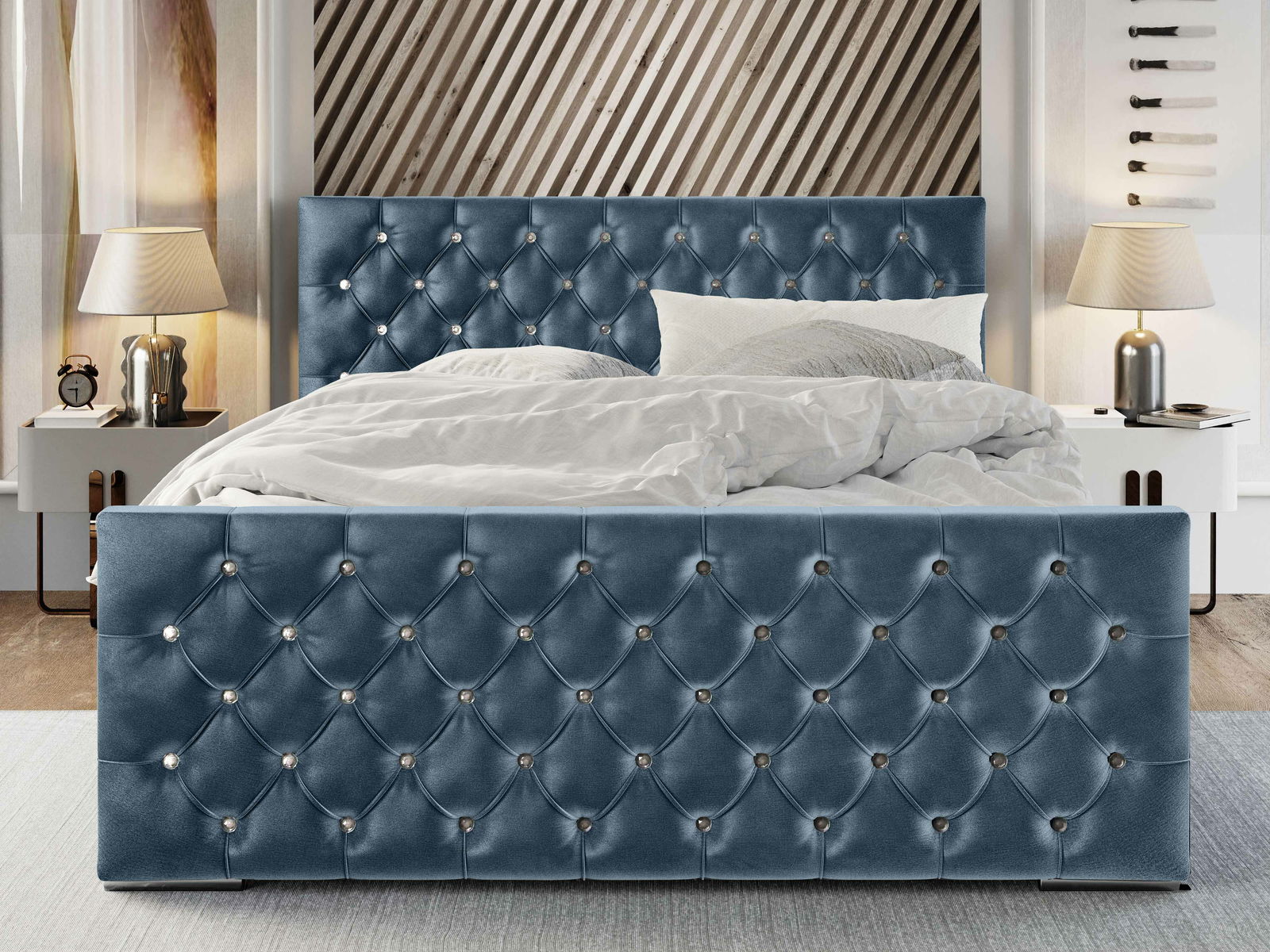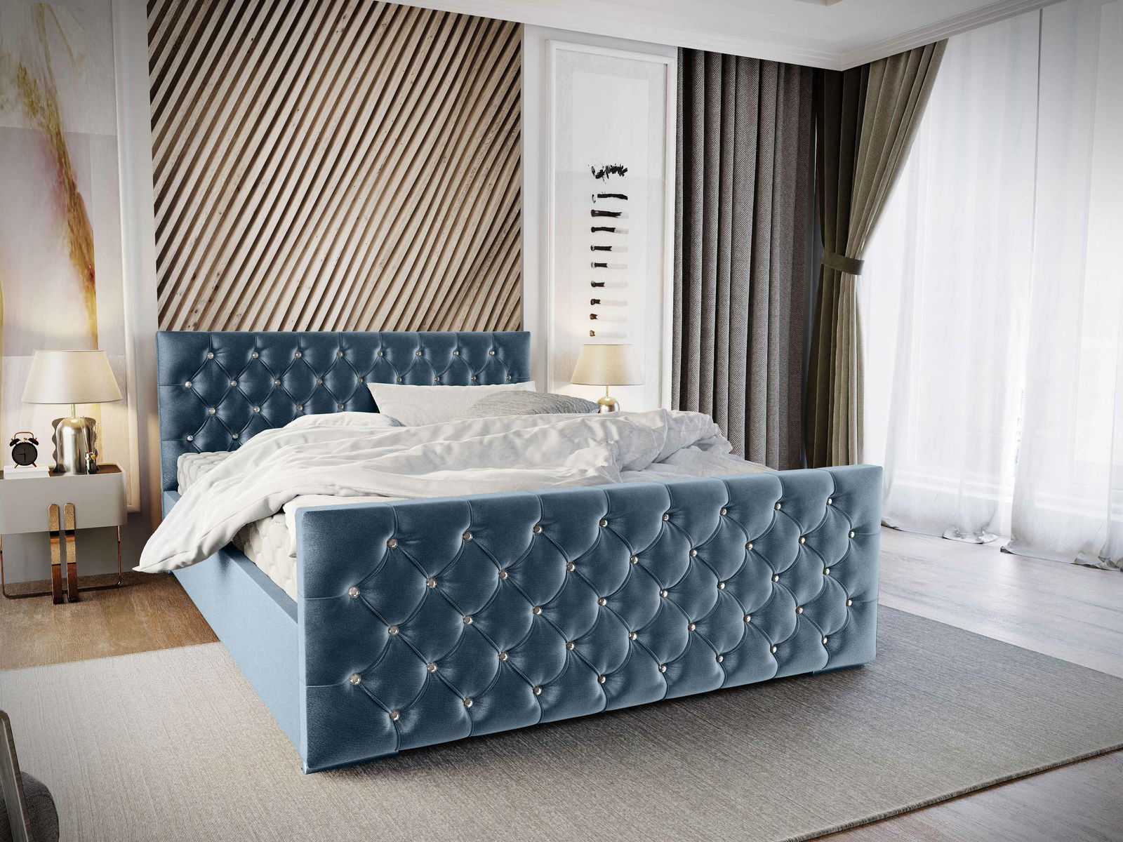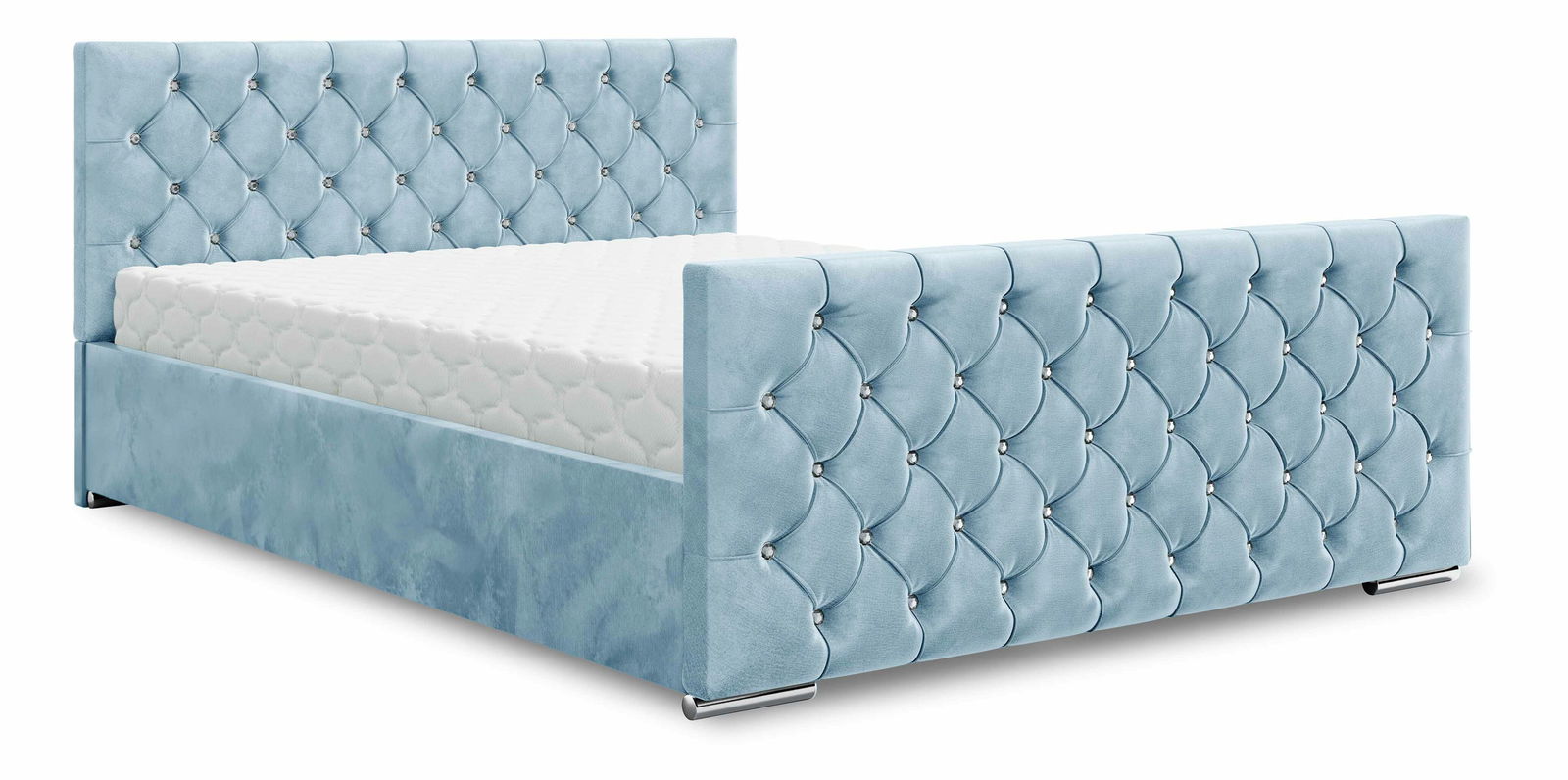 Manželská posteľ 180 cm Quintin v modrej farbe s roštom a úložným priestorom je elegantným a praktickým doplnkom každej spálne. Série Quintin sú zdobené gombíkmi vo vnútri aj vonkajšej časti postele. Vnútri postele sa nachádza rošt a dostatočne veľký úložný priestor na posteľnú bielizeň. Tkanina použitá na posteľ je Monolith 72, ktorá má vysokú odolnosť a pevnosť. Konštrukcia postele je z kombinácie drevotriesky a dreva. Výška čela postele je 115 cm, bočnice sú 35 cm vysoké a celková dĺžka postele je 210 cm. Maximálne zaťaženie postele je 240 kg. Posteľ je dodávaná v troch balíkoch, spolu so všetkými potrebnými súčasťami pre montáž. Matrac nie je súčasťou produktu, ale môžete si ho vybrať a priobjednať z našeho internetového obchodu.