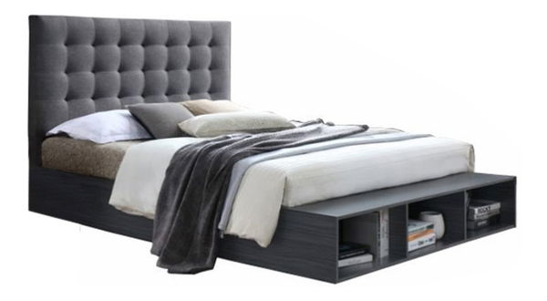 Elegantné prešívané čelo postele umožňuje komfort pri čítaní alebo relaxovaní. Poťah postele je vyrobený z látky v sivej farby. Posteľ navyše obsahuje aj vstavaný regál, ktorý sa nachádza v spodnej časti postele.