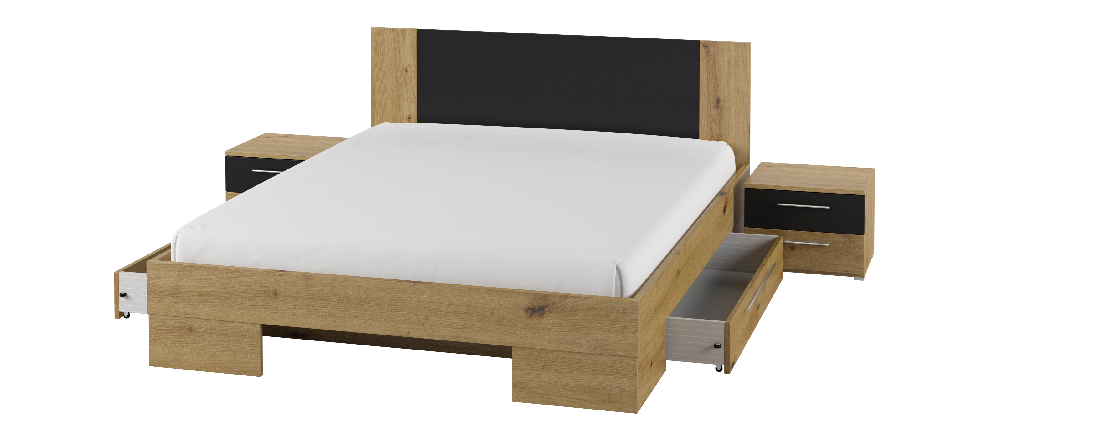 Manželská posteľ Verwood vznikla spojením moderného dizajnu a kvalitných materiálov, ktoré vám zaručia pokojný a pohodlný spánok. Okrem postele sú v cene aj dva nočné stolíky v rovnakom farebnom prevedení, takže budú spolu dokonale zladené. Stolík má dve zásuvky, vďaka čomu budete mať všetky potrebné veci poruke.