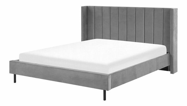 Elegantná posteľ s moderným dizajnom a vysokým operadlom. Obdĺžnikový tvar postele môže na prvý pohľad pôsobiť klasickým dojmom, no vďaka zvislému prešívaniu na čele vyzerá moderne a štýlovo. Celá posteľ je čalúnená zamatovou látkou v sivej farbe, ktorá jej dodáva sofistikovaný vzhľad. Malé nohy sú síce nenápadné, ale zaručujú stabilitu a pevnosť celej konštrukcie.