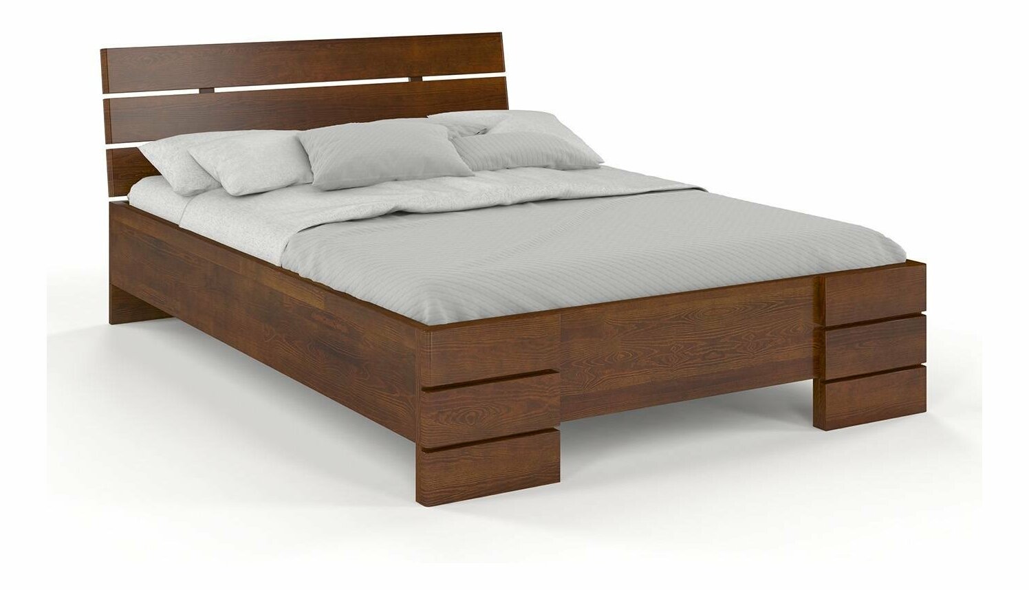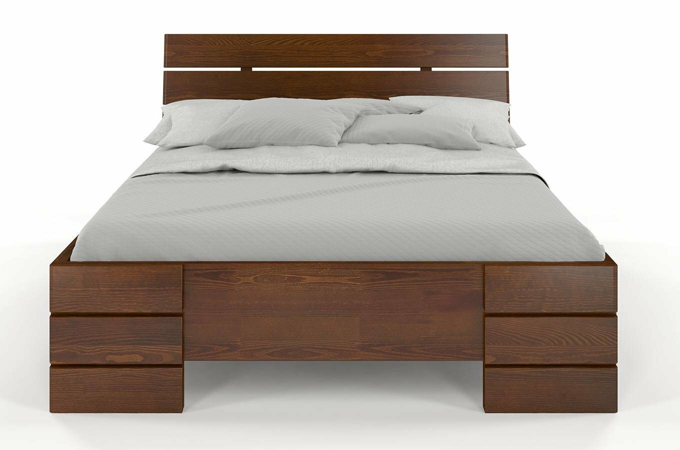 Manželská posteľ Lorenskog High vysoká 85 cm a s dĺžkou 217 cm je vyrobená z borovicového dreva. Konštrukcia postele je pevná a stabilná s nosníkom tzv. "piata noha", ktorý podopiera posteľ v strednej časti a zvyšuje tak pevnosť. Posteľ má dvojitú vrstvu tvrdeného laku, ktorý zvyšuje jej odolnosť voči škrabancom. Šírka postele je 205,5 cm a dĺžka je 217 cm, s možnosťou predĺženia na 237 cm. Posteľ je dodávaná bez roštu a matraca. Produkt si môžete vybrať aj v iných farbách morenia a vo veľkostiach šírky 160, 180 a 200 cm. Záruka na posteľ je až 8 rokov.