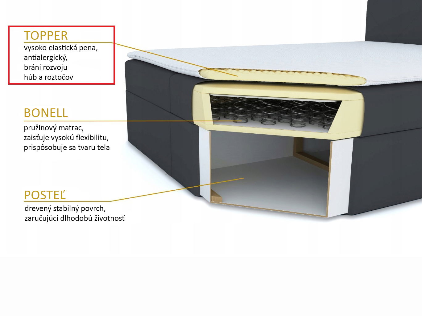 ZobraziťManželská posteľ Boxspring 140x200 cm Waller (sivá) (s roštom a matracom) výška 47-102 cm hĺbka 208 cm Itaka_50 je luxusná posteľ s vysokým komfortom. Spodný matrac z kvalitných pružín nahrádza lamelový rošt a vytvára pohodlný základ pre vaše spanie. Vrchný matrac s hrúbkou 4 cm je možné si objednať zvlášť. Tkanina Itaka 50 je odolná a má estetický vzhľad. Posteľ má úložný priestor prístupný zo strany. Výška 47 cm umožňuje ľahké vstávanie z postele a výška opierky hlavy 102 cm zabezpečí optimálne podporu chrbtice. Produkt je dodávaný v 3 balíkoch.