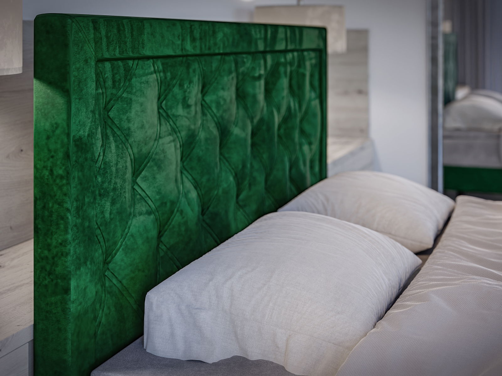 ZobraziťManželská posteľ Boxspring 160 cm Dustin (tmavozelená) (s matracom a úložným priestorom) je elegantná posteľ pre luxusnú spálňu. Fľaškovo zelená farba dodáva eleganciu a jemnosť. Posteľ je vyrobená z dvoch samostatných lôžok, ktoré je možné vyklopiť z bočnej strany. Po zodvihnutí matracov sa zjaví úložný priestor na každej strane. Posteľ stojí na vyšších (13 cm) sivých kovových nožičkách. Posteľ je vysoká 53 cm a vnútro postele je z bielej dosky o hrúbke 16 mm. Čelo postele je polstrované 3 cm širokými pólamy s pešívaním. Posteľ má výšku ložnej plochy 53 cm a plocha na spanie je 160x200 cm. Topper je súčasťou produktu a je vyrobený z T-21 peny o výške 5 cm. Matrace sú vyrobené z T-25 peny a Bonellových pružín o výške 20 cm s tvrdosťou T2. Rám postele je biely, drevo + laminovaná doska 16 mm. Posteľ má nosnosť jedného lôžka 120 kg. Tkanina Magic Velvet 2225 je zamatová látka, ktorá je hebká a jemná na dotyk. Látka má certifikát o vlastnostiach spomaľujúcich horenie a Cleanaboo vlastnostiach. Zloženie tkaniny je 100% polyester a gramáž je 300g/m2 +/- 5%. Test oderuvzdornosti Martindale má hodnotu 60 000 cyklov. Posteľ je dodávaná v 4 balíkoch s celkovou hmotnosťou 140,5 kg. Pri objednávke iného farebného prevedenia ako je na obrázku je potrebná záloha vo výške 50% z ceny produktu s DPH vopred.