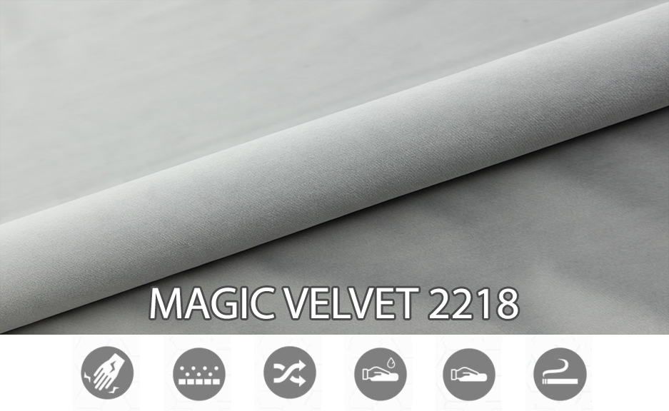 Magic Velvet je zamatová látka, ktorá je hebká a jemná na dotyk. Je vysoko odolná proti oderu a pri používaní sa nežmolkuje. Látka Magic Velvet má certifikát o vlastnostiach spomaľujúcich horenie a Cleanaboo vlastnostiach, ktoré zabraňujú vstrebávaniu tekutiny do konštrukcie nábytku. Materiál navyše získal certifikát PETPROOF, ktorý potvrdzuje jeho vysokú odolnosť voči škrabancom spôsobeným zvieracími pazúrmi. Zloženie 100% polyester. Gramáž 300g m2 +/- 5%.