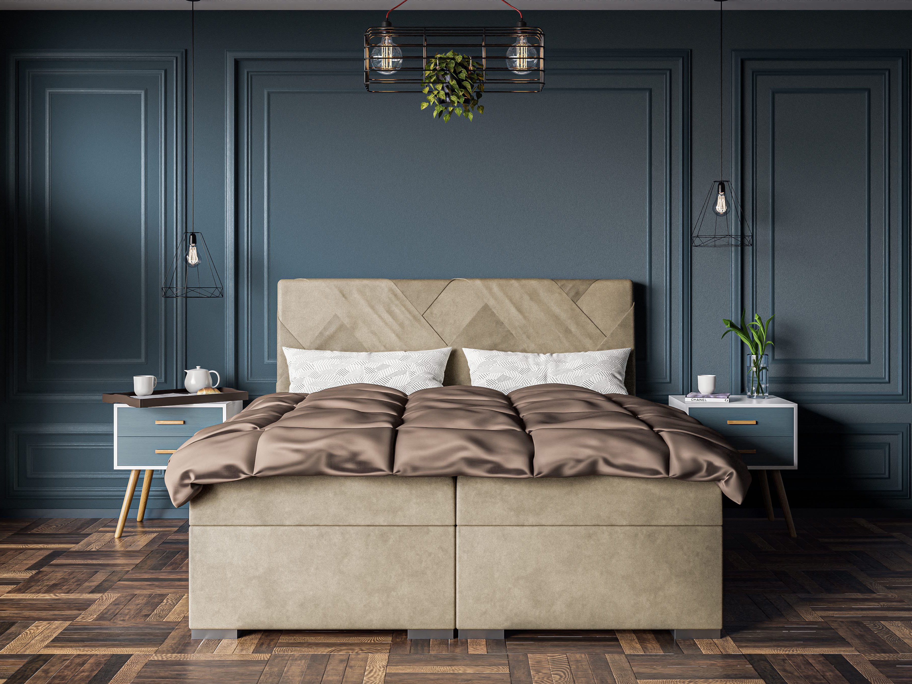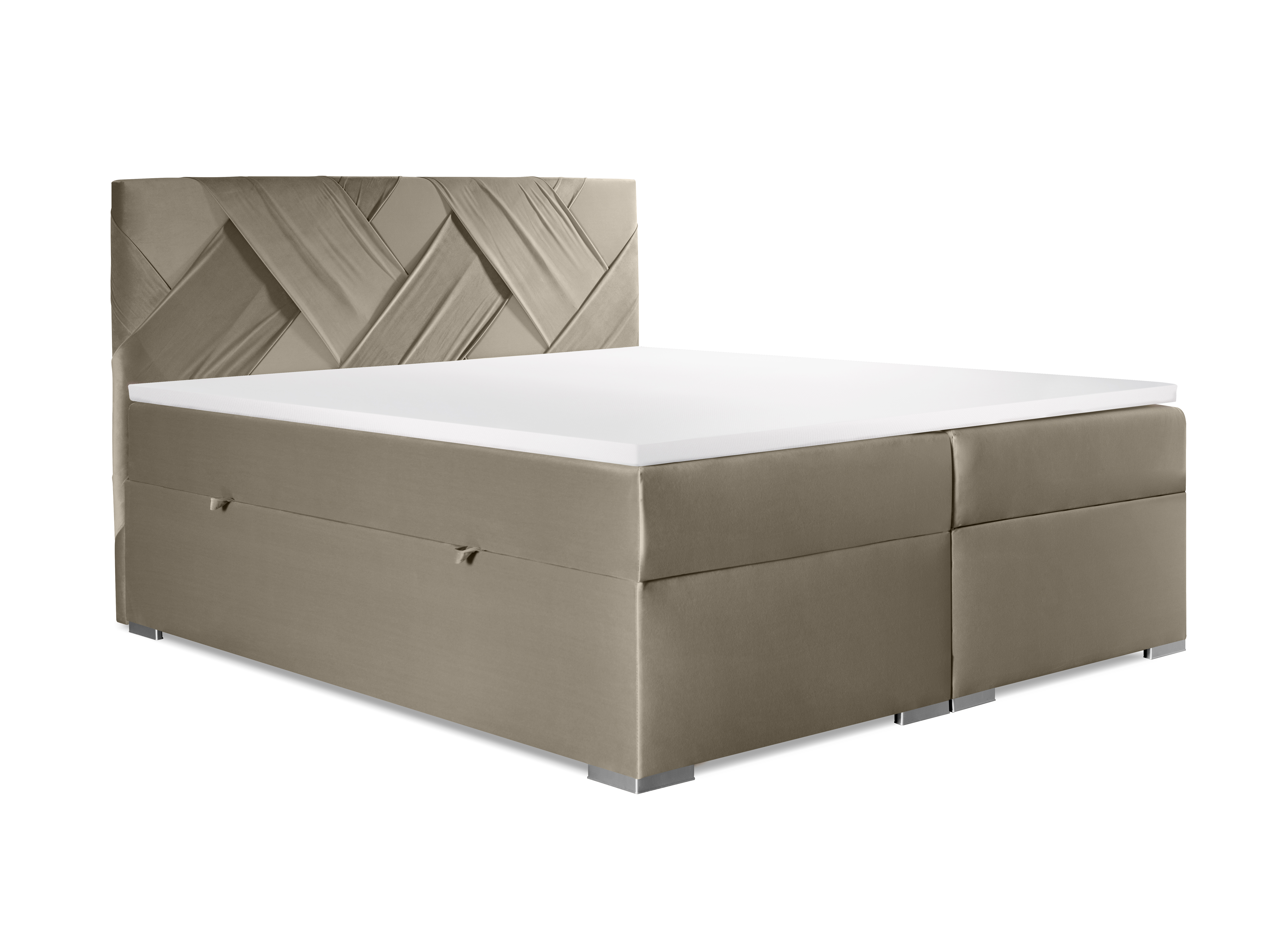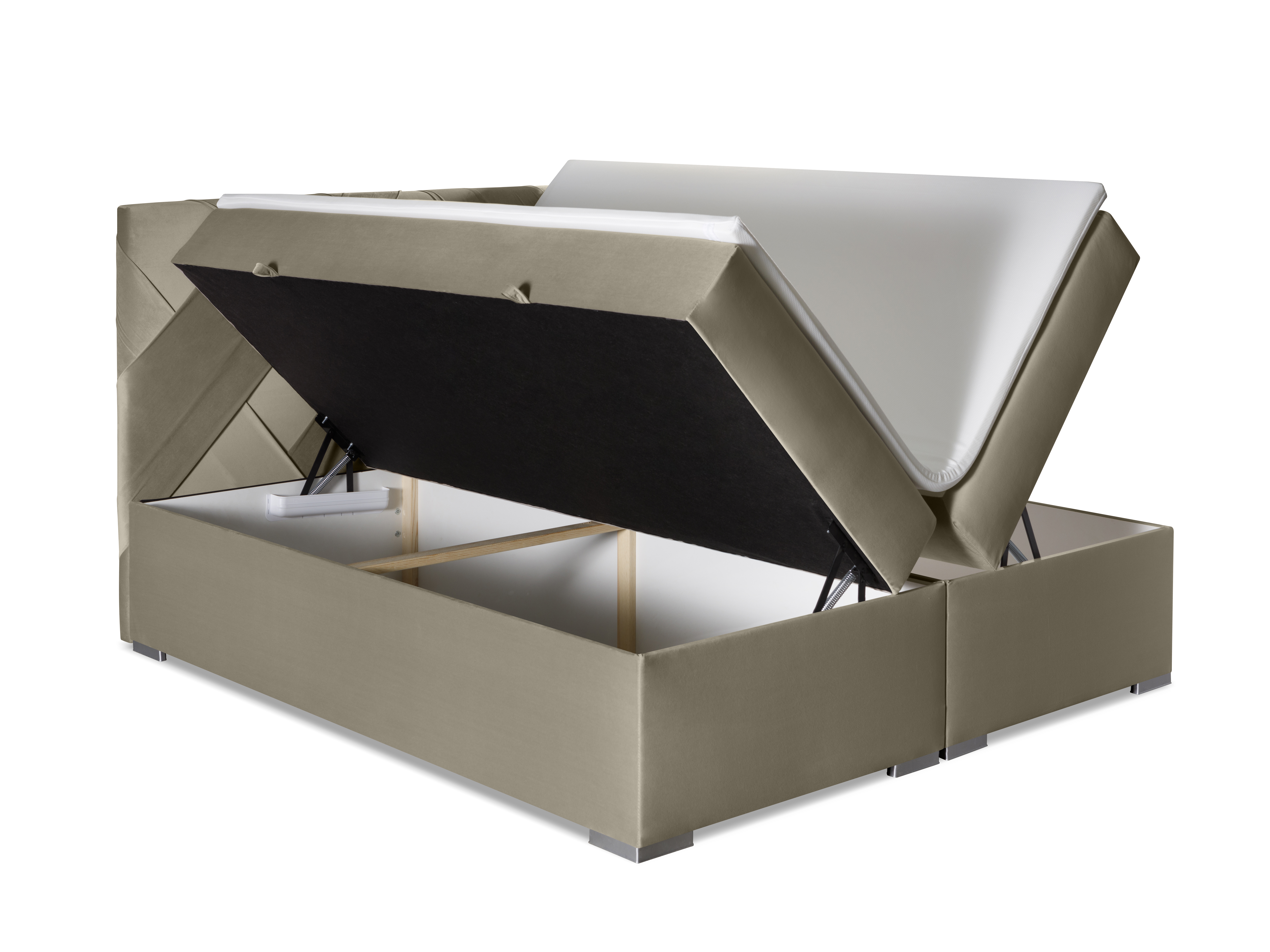 Manželská posteľ Boxspring 160 cm Melo (zlatá) (s úložným priestorom) je pohodlná a praktická posteľ pre dokonalý spánok. Súčasťou postele je matrac s topperom z peny T-25 a pružín Bonell, s výškou 20 cm. Vrchný matrac, topper, je vyrobený z peny T-21 o výške 5 cm. Konštrukcia postele je z laminovanej drevotriesky bielej farby, s úložným priestorom, ktorý je výklopný zboku a k nemu sa dostanete vyklopením roštovej dosky s matracom z bočnej strany postele. Tkanina Magic Velvet, z ktorej je postel vyrobená, je vysoko odolná proti oderu a nežmolkuje sa pri používaní. Jej certifikované vlastnosti spomaľujú horenie, majú vysokú odolnosť voči škrabancom spôsobeným zvieracími pazúrmi a bránia vstrebávaniu tekutiny do konštrukcie nábytku. Posteľ má výšku 65-118 cm, dĺžku 207 cm a plochu spania 160x200 cm. Nosnosť postele na lôžko/osobu je 120 kg. Posteľ je dodávaná v balíkoch o celkovej hmotnosti 178 kg.