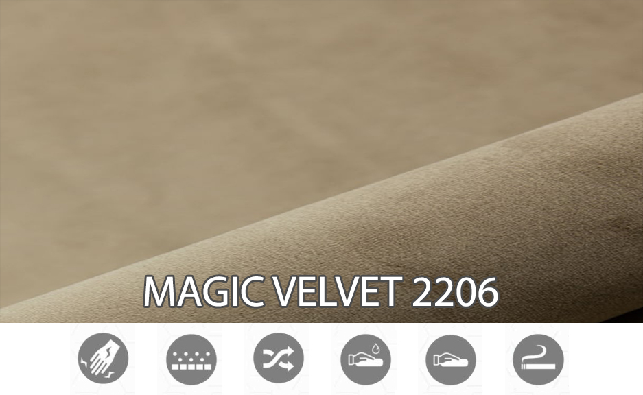 Magic Velvet je zamatová látka, ktorá je hebká a jemná na dotyk. Je vysoko odolná proti oderu a pri používaní sa nežmolkuje. Látka Magic Velvet má certifikát o vlastnostiach spomaľujúcich horenie a Cleanaboo vlastnostiach, ktoré zabraňujú vstrebávaniu tekutiny do konštrukcie nábytku. Materiál navyše získal certifikát PETPROOF, ktorý potvrdzuje jeho vysokú odolnosť voči škrabancom spôsobeným zvieracími pazúrmi. Zloženie 100% polyester. Gramáž 300g m2 +/- 5%.