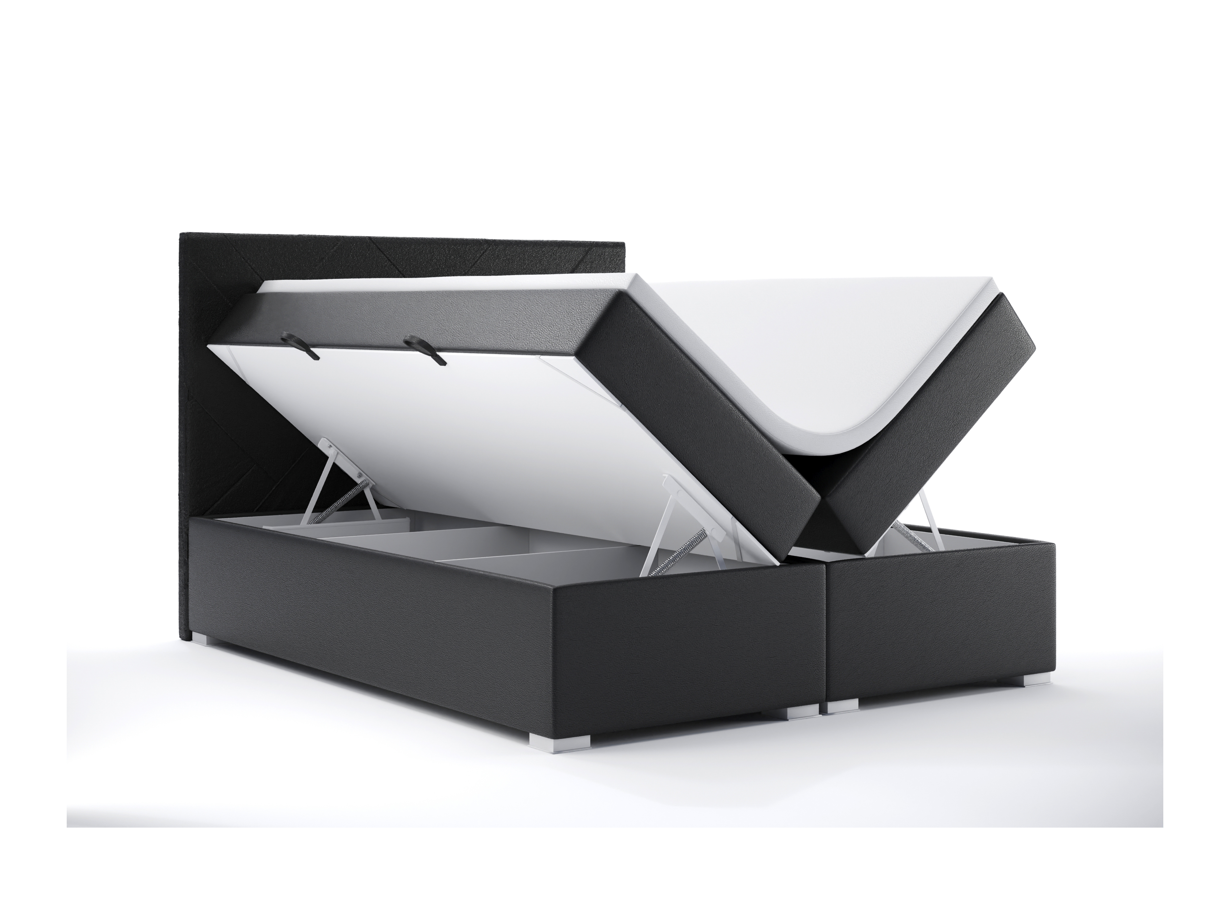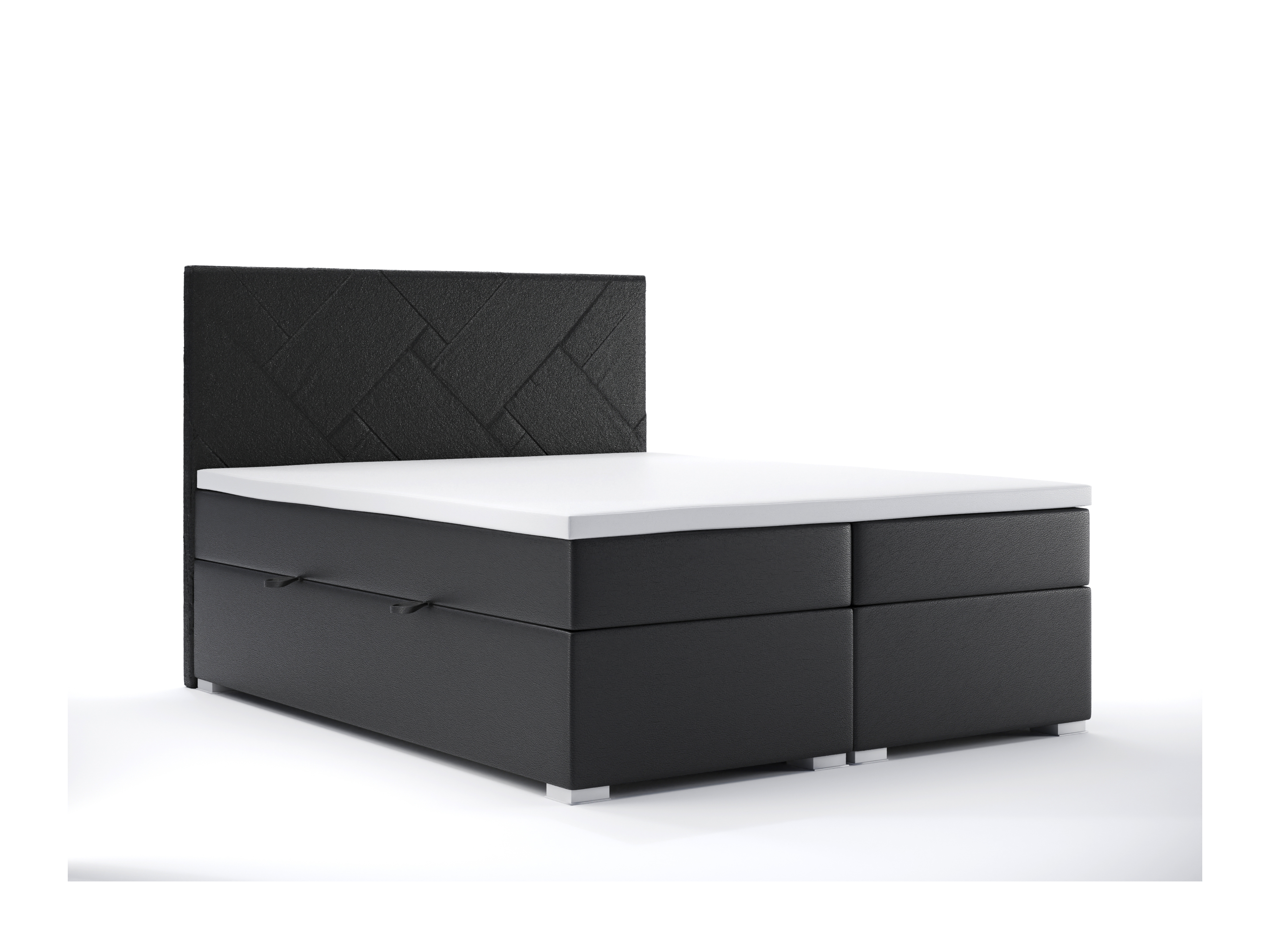 Manželská posteľ Boxspring 180 cm Melo (čierna ekokoža) je moderná posteľ so skvelými funkčnosťami. Konštrukcia postele je vyrobená z laminovanej drevotriesky (16 mm) bielej farby a nožičky z plastu v sivej farbe. Posteľ je vybavená úložným priestorom, ktorý je výklopny zboku a matracom s topperom z peny T-25 a pružin Bonell o výške 20 cm. Vrchný matrac (topper) je vyrobený z peny T-21 o výške 5 cm. Tkanina ekokože Madryt je mimoriadne odolná a dosiahla oderové skóre Martindale presahujúce 100 000 cyklov. Posteľ má výšku 65 - 118 cm a celkovú nosnosť na lôžko/osobu 120 kg. Balíky sú rozdelené na 4 časti s celkovou hmotnosťou 178 kg. Tento produkt je k dispozícii aj v iných farebných prevedeniach so zálohovou platbou vo výške 50% z ceny produktu s DPH.