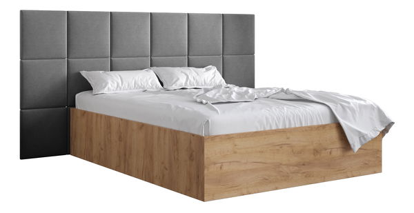 Manželská posteľ s čalúneným čelom 160 cm Brittany 4 (dub craft zlatý + sivá) (s roštom) výška 40 cm hĺbka 203,2 cm Dub craft zlatý + Sivá je elegantná a jemne dizajnovaná posteľ, ktorá zapadne do každej spálne. Konštrukcia z laminovanej dosky a odolný borovicový rošt zaručia komfort používania na roky. K posteli patria mäkké farebné panely, ktoré dodajú posteli nevšedný vzhľad. Posteľ má plochu na spanie 160x200 cm a úložný priestor nie je k dispozícii. Korpus postele je z laminovanej dosky 16 mm a rošt z borovicového dreva. Posteľ nemá nožičky, ale lem je ukončený odolnou PVC dyhou. Matrac nie je súčasťou ceny, vhodný je pružinový alebo taštičkový s minimálnou výškou 15 cm. Posteľ má 18 čalúnených panelov s rozmermi 42x42x4 cm, ktoré tvorí 8 mm hrubá doska, 3 cm hrubá pena T18 a tkanina Manila 16. Manila je trvácna a odolná voči treniu a oderu, má nehorľavé vlastnosti a možno ju prať ručne pri nízkych teplotách. Posteľ sa dodáva v 2 balíkoch a balík s panelmi obsahuje 18 kusov po 43x43x2 cm.