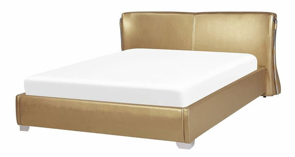 Táto čalúnená kožená vodná posteľ sa stane dokonalým stredobodom spálne. Zlatá farba koženého čalúnenia vnesie do priestoru textúru a teplo a konštrukcia z masívneho dreva zaručí stabilitu a pokojný spánok. Krátke strieborné nohy dopĺňajú dizajn postele a lesklý povrch čalúnenia pôsobí sofistikovaným dojmom.