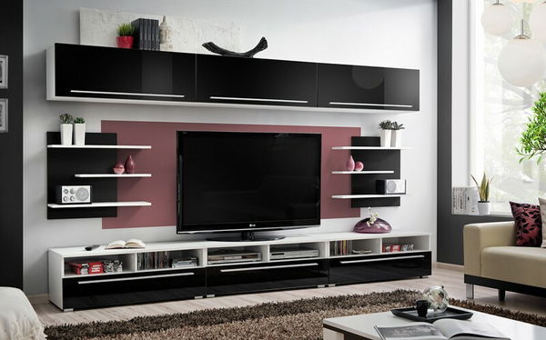 Moderná obývacia stena od výrobcu ASM spraví z Vašej obývacej izby štýlový priestor. Korpus bielej farby je doplnený o fronty v leskej čiernej farbe. Panel poličiek je čiernej matnej farby. Celkový dizajn dopĺňajú dlhé úchyty v chromovej farbe s dĺžkou 80 cm. Tri bloky TV stolíkov, skriniek na stenu, dva panely s poličkami tvoria tú dokonalú zostavu práve pre Vás.