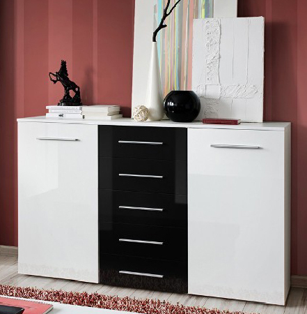 Komoda Fox je vyrobená ako doplnok do obývacích izieb, spální alebo pracovní. Je trojdielna, pričom po stranách je úložný priestor s dvomi policami, ktorý je uzavretý dvierkami. V strede sa nachádza päť zásuviek. Celkový dizajn podtrhujú elegantné podlhovasté uchyty. Vrchná časť komody môže slúžiť ako odkladací priestor na dekoračné predmety. Vďaka množstvu farebných prevedení je ju možné ľahko kombinovať s ostatným nábytkom v miestnosti.