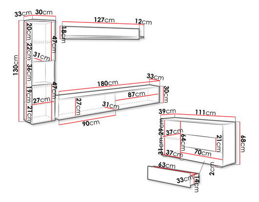Súprava nábytku do obývačky je ideálnou voľbou pre tých, ktorí hľadajú pohodlie a štýl. Rozmery prvkov: Vitrína: šírka: 30 cm, výška: 130 cm, hĺbka: 33 cm, Závesná polica: šírka: 127 cm, výška: 18 cm, hĺbka: 12 cm, Skriňa RTV: šírka: 180 cm, výška: 30 cm, hĺbka: 33 cm, Komoda 110: šírka: 111 cm, výška: 68 cm, hĺbka: 39 cm Dizajn: laminovaná doska 15 mm, čelá: matná alebo polyglosová doska 15 mm, okraje z ABS, zadný okraj z papiera, model bez držadiel, otváranie pomocou predných častí vyčnievajúcich nad telo, štandardné závesy mini boxov, vodiace valčeky, systém otvárania "PUSH TO OPEN", skrinka a skrinka RTV sú univerzálne - možno ich zavesiť alebo postaviť (nožičky sú súčasťou dodávky), nožičky: plast hliníkovej farby (výška 2 cm), osvetlenie LED SQAURE ako dodatočná možnosť za príplatok Záruka: 24 mesiacov