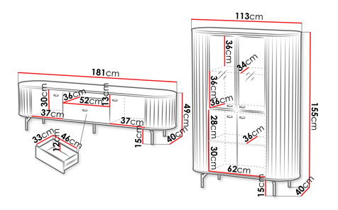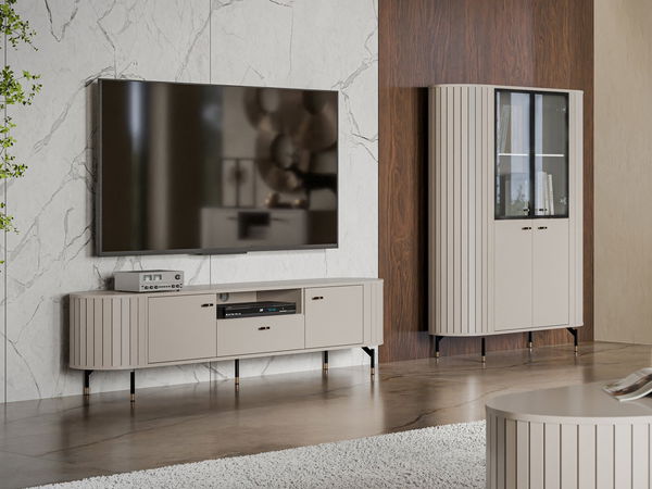 ZobraziťZostava nábytku do obývacej izby je ideálnou voľbou pre tých, ktorí hľadajú pohodlie a štýl. Rozmery: Vitrína Terkiro 2D2W TR01: šírka: 113 cm, výška: 155 cm, hĺbka: 40 cm, TV skrinka Terkiro 180 2D1S TR05 : šírka: 181 cm, výška: 49 cm, hĺbka: 40 cm, Prevedenie: korpus: laminovaná drevotrieska hrúbky 16 mm, čelá: laminovaná drevotrieska hrúbky 16 mm + ozdobné lišty MDF, hrana: ABS + PVC, zadná stena z laminovanej drevotriesky hrúbky 16 mm, nohy a rukoväte: oceľ, pánty FI35 s tichým zatváraním, guľôčkové vedenie s tichým zatváraním L-350 (TV skrinka), tvrdené, priehľadné, leštené sklo, hrúbka 6 mm, jedna sklenená polica (vitrína), LED osvetlenie ako doplnková možnosť za príplatok Záruka: 24 mesiacov