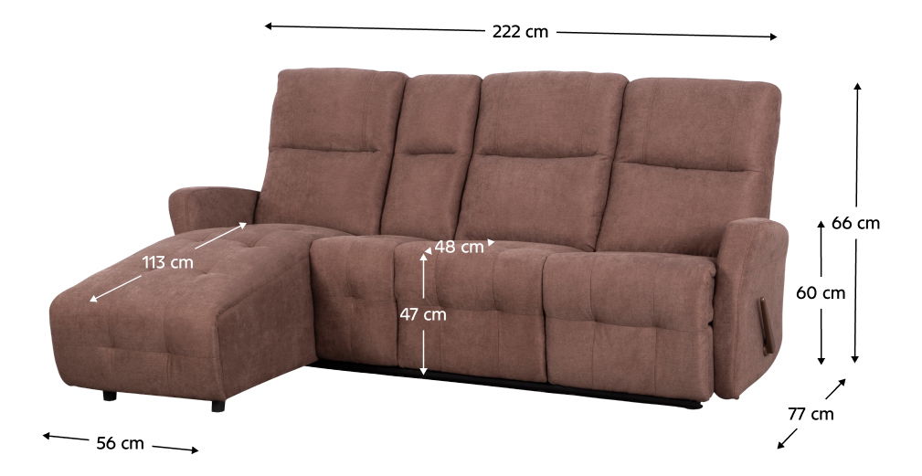 Moderná polohovacia a relaxačná rohová sedacia súprava Toran ROH v hnedej farbe je ideálnym doplnkom pre váš priestor, ktorý prinesie pohodlie a oddych. Sedacia súprava má čeločalúnené sedadlá a chrbty pre väčší komfort. Sklápací držiak na občerstvenie medzi otomanovou časťou a dvojsedom je ďalšou výhodou tejto súpravy. Podnož sa vysunie pomocou páčky na bočnej strane sedačky a operadlo sa sklopí jednoduchým potlačením dozadu. Výplň sedacej súpravy tvorí kvalitná pružina falista v kombinácii s PUR penou pre ešte väčší komfort. Polohovanie je možné iba na pravej časti dvojseda, zvyšok je pevný. Sedačka má výšku 100 cm, šírku 222 cm a hĺbku 66 cm.