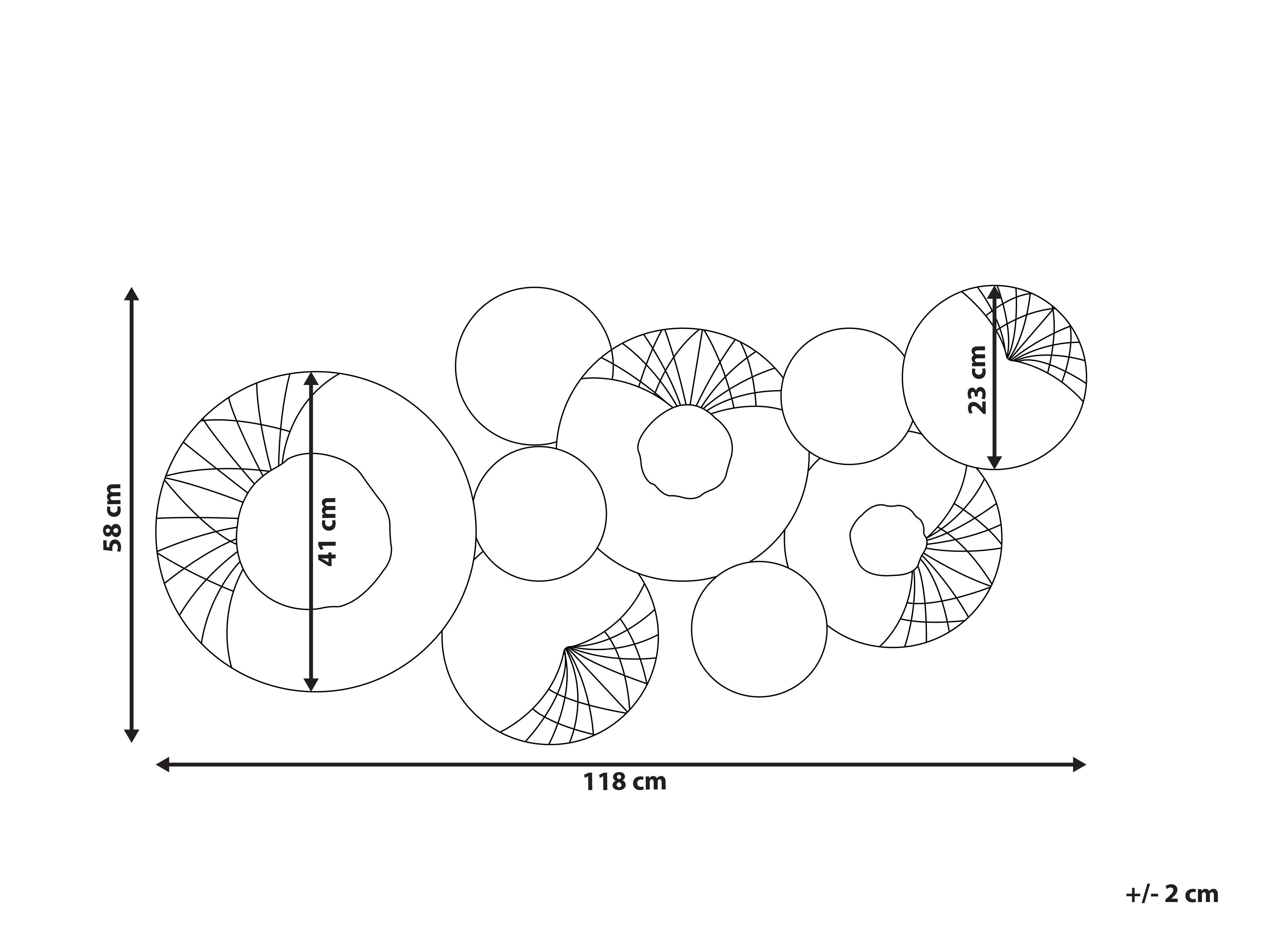 Táto nástenná dekorácia z bielych, strieborných, čiernych a medených kruhov vnesie do každého interiéru nádych industriálneho štýlu. Jej konštrukcia je stabilná a odolná, ale pôsobí veľmi jemne. Dekorácia s mierne neupraveným povrchom je dokonalým doplnkom nielen do moderných interiérov, ale aj do interiérov zariadených v retro štýle. Vďaka háčikom a jedinečnému dizajnu ju možno zavesiť do vodorovnej alebo zvislej polohy.