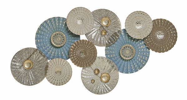 Rozjasnite svoj obývací priestor touto fascinujúcou modernou dekoráciou na stenu. Okrúhle kovové tvary, ktoré sú nepravidelne usporiadané do jedinečnej 3D kompozície, dodajú každému interiéru orientálny nádych. Vďaka háčikom možno dekoráciu zavesiť horizontálne alebo vertikálne. Umiestnite ju nad skriňu alebo pohovku a tešte sa zo zaujímavej bytovej dekorácie.