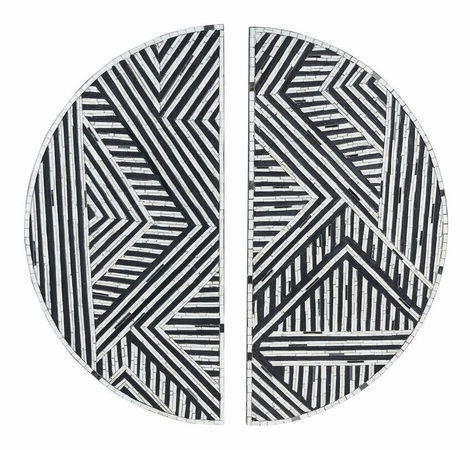 Ak hľadáte spôsob, ako ozdobiť steny v interiéri originálnymi doplnkami, táto dekorácia bude dokonalou voľbou. Pozostáva z dvoch polkruhových častí, ktoré spolu vytvárajú okrúhlu nástennú dekoráciu. Geometrický vzor v čierno-bielej kombinácii vnesie do priestoru exotickú atmosféru a určite pritiahne pozornosť. Vďaka háčikom na zadnej strane ju možno jednoducho zavesiť na stenu.