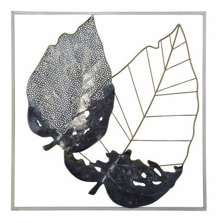 Nechajte steny v interiéri vyniknúť a skrášlite ich touto jedinečnou nástennou dekoráciou. Štvorcový rám lemuje dva veľké listy vyrobené z veľmi kvalitného kovu. Listy s otvorenou štruktúrou z pevného kovu vytvárajú dizajn, ktorý je spojením organických a industriálnych tvarov. Skrášlite si interiér výrazným kúskom, ktorý vám bude robiť radosť roky.