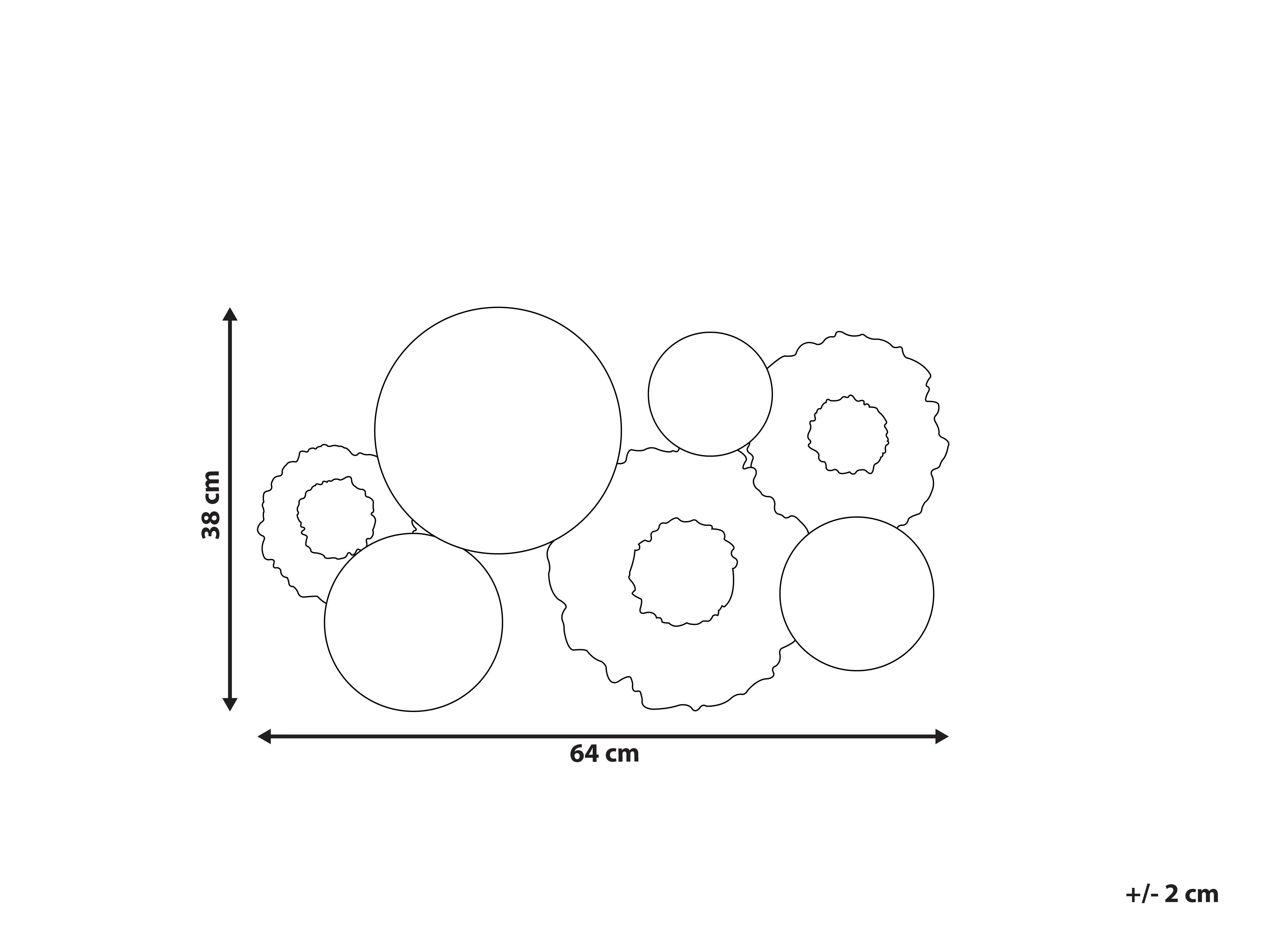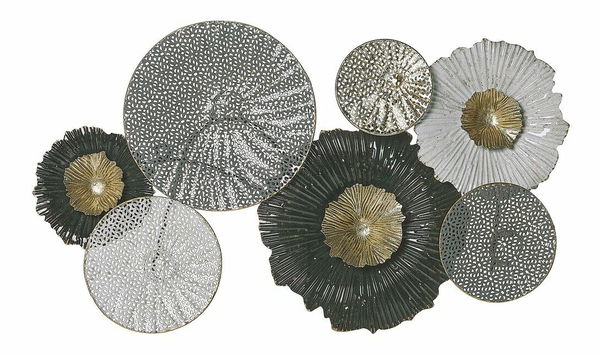 Táto jemná a zároveň pevná nástenná dekorácia je vyrobená z kovu a je skvelým doplnkom do moderných a industriálne zariadených interiérov. Čierne, strieborné, zlaté a biele kruhy vytvárajú jedinečnú 3D kompozíciu, ktorá vďaka svoju nepravidelnému tvaru vnesú do priestoru štipku štýlu art deco. Vysokokvalitné materiály a kvalitné spracovanie sú zárukou odolnosti a trvácnosti dekorácie.