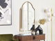 Toto dekoratívne nástenné zrkadlo rozjasní vzhľad vášho interiéru. Elegantný tvar inšpirovaný orientálnym štýlom doplní akúkoľvek spálňu, kúpeľňu alebo chodbu. Zrkadlo je ručne vyrobené z kvalitného skla, má jednoduchý kovový rám v zlatom farebnom prevedení a praktický háčik na zadnej strane.