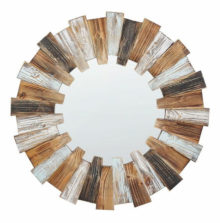 Váš interiér bude vyzerať výborne, ak ho zariadite štýlovým nábytkom a krásnym nástenným zrkadlom. Toto ručne vyrobené okrúhle zrkadlo má ozdobný rám vo farbe dreva, ktorý dopĺňajú čierne a biele detaily. Stane sa skvelým doplnkom obývacej izby alebo predsiene v rustikálnom alebo tradičnom štýle.