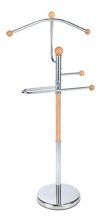 Praktický nemý sluha v klasickom dizajne. Konštrukcia je kombináciou kovových trubiek s kovovou podestou a masívneho dreva. Povrchová úprava je v lesklom chróme a prírodného odtieňa kaučukovníkového masívu. Výška 112 cm Vám umožní zavesenie oblečenia aj doplnkov bez pokrčenia. Nosnosť stojana je až 5 kg, hmotnosť necelých 5 kg. Preto je jednoducho prenositeľný a je možné ho umiestniť podľa momentálnej potreby aj nálady. Štýlom a jednoduchosťou sa hodí do akéhokoľvek interiéru. Využitie je nepreberné, záleží len na Vás.
