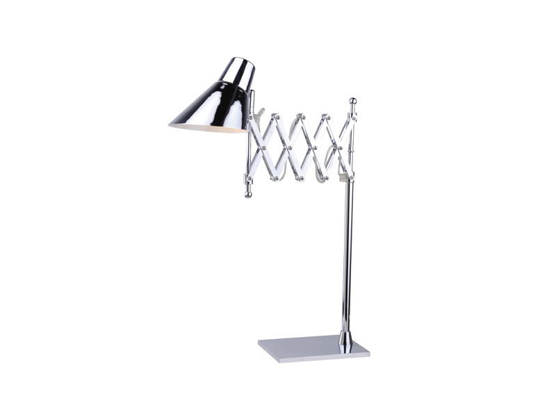Originálna stolná lampa KM106T s nastaviteľným tienidlom. Lampa má modifikovatelné tienidlo a kovová konštrukcia lampy je vo farebnom podaní lesklého chrómu. Lampa je vyrobená z kombinácie skla a kovu.