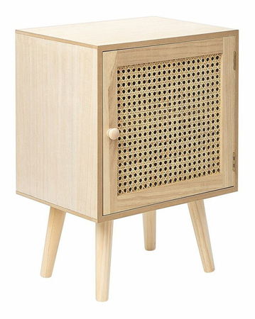 Každá spálňa potrebuje úložný priestor v blízkosti postele a najjednoduchší spôsob, ako ho získať, predstavuje nočný stolík. Tento stolík je vyrobený z kvalitne spracovaného dreva s drevenou dyhou a nevyžaduje si každodennú údržbu. Skrinka ukrytá za dvierkami s ratanovou prednou stranou určite zaujme všetky pohľady a pritiahne pozornosť.