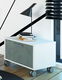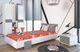 Jednoduchý nočný stolík v bielom prevedení na čiernych kolieskach so sivou zásuvkou. Materiál DTD.
