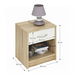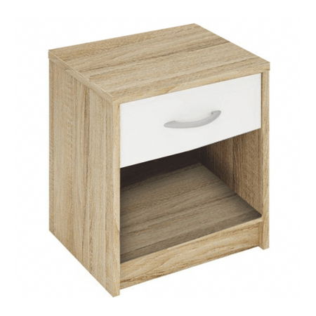 Jednoduchý nočný stolík v prevedení dub sonoma s jednou zásuvkou v bielej farbe v hornej časti a poličkou v časti dolnej.