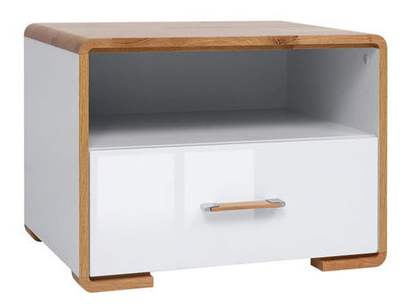 Stolík obsahuje 1 zásuvku na valčekových koľajničkách a 1 otvorenú policu. Dostupný vo farebnom prevedení: biely + dub prírodný/biely vysoký lesk.