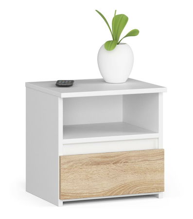 Nočný stolík Crispian (biela + dub sonoma) je praktickým a štýlovým doplnkom pre váš spálnňový interiér. S výškou 40 cm, šírkou 40 cm a hĺbkou 35 cm, poskytuje dostatok úložného priestoru pre vaše osobné veci. Jeho kombinácia bielych a dubových tónov dodáva stolíku moderný a elegantný vzhľad, ktorý sa hodí do akéhokoľvek štýlu zariadenia. Vhodný na umiestnenie vedľa postele, poskytuje pohodlné miesto pre lampu, knihu alebo iné potrebné veci. Nočný stolík Crispian je vyrobený z kvalitných materiálov, čo zaručuje jeho trvácnosť a odolnosť. Nechajte sa očariť jeho jednoduchým dizajnom a praktickými vlastnosťami, ktoré vám uľahčia organizáciu vašej spálne.