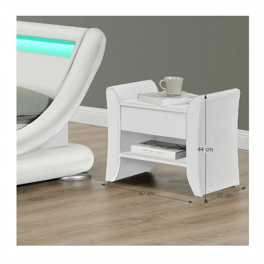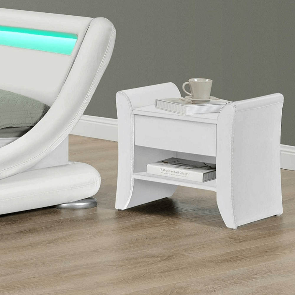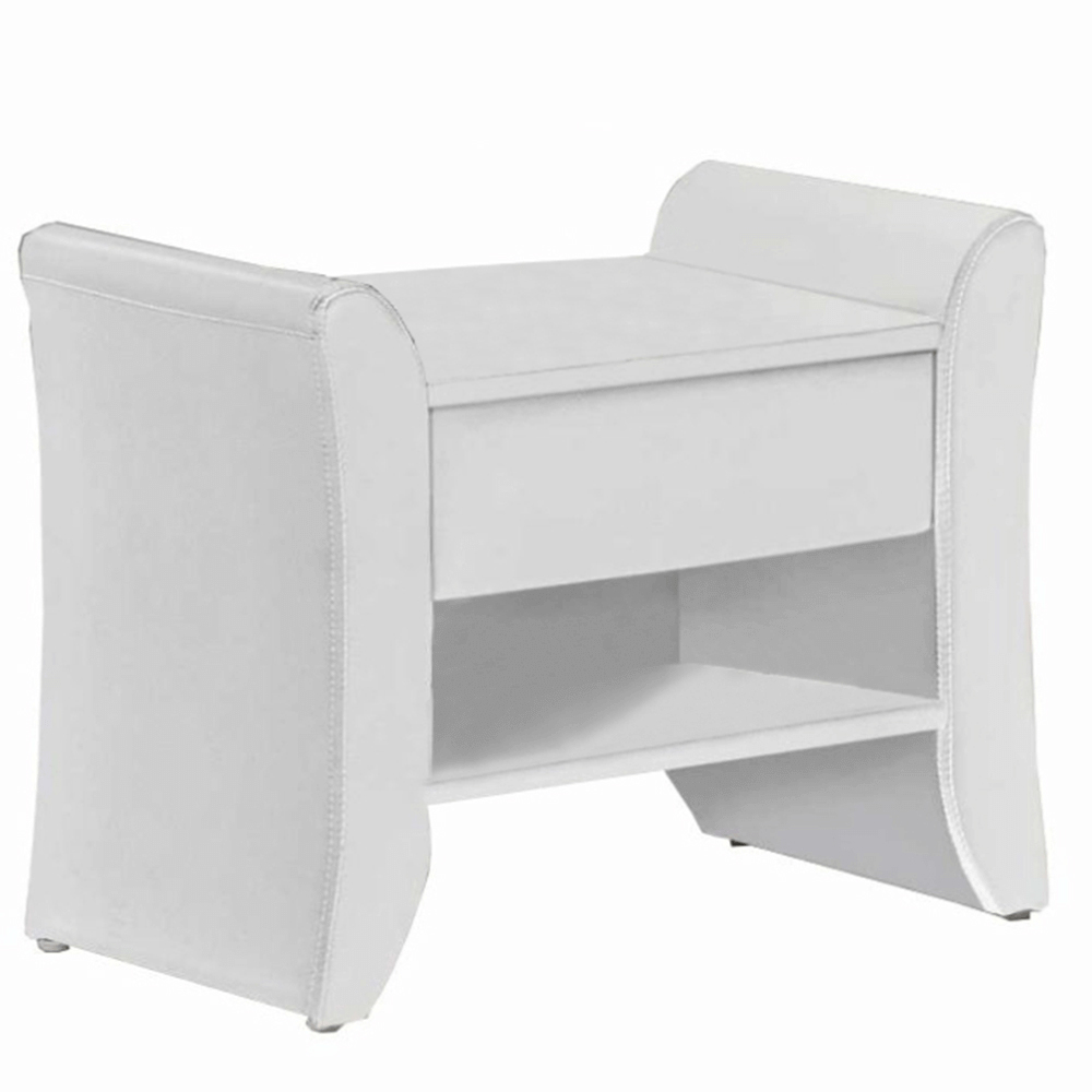 Elegantný nočný stolík je čalúnený ekokožou, ktorá je nenáročná na údržbu a pôsobí príjemne. Tento nočný stolík je jedinečný aj svojím úložným priestorom, ktorý zabezpečuje jedna zásuvka a jeden otvorený priestor.