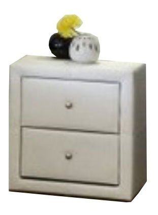 Nočný stolík s dvomi zásuvkami vyrobený z bielej ekokože. Drobné guľaté úchyty.
